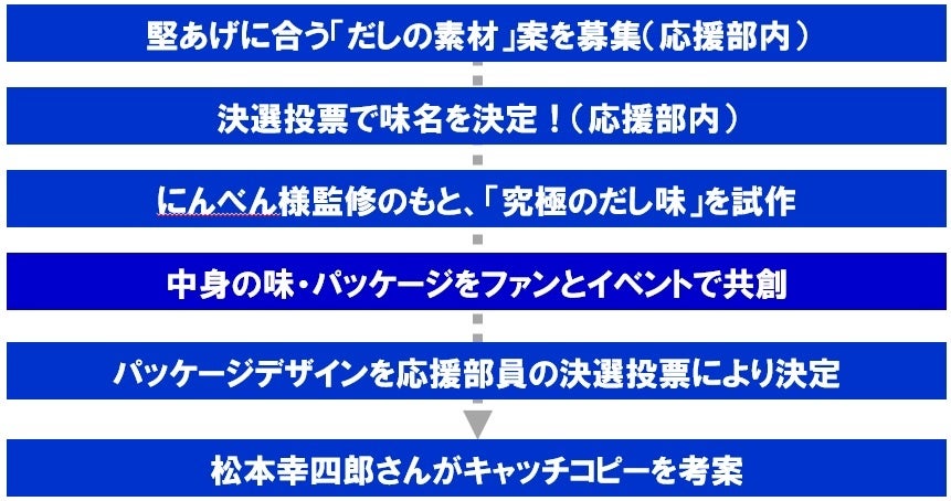 開発にあたっては、まず応援部員から「堅あげポテト」に合う“だし素材案”を募集。集まった全591件のアイデアの中から3案に絞り込み、応援部員で決選投票を行いました。その結果、「かつおだし×昆布だし×椎茸だしベース」の味に決定。にんべん監修のもと3ヶ月にわたり「究極のだし味」の試作を重ねました。さらに、応援部員とイベント(試作品を試食し、改良の方向性を議論・パッケージデザインのアイデア発表)を実施。応援部員にパッケージデザイン投票をしていただき、味・パッケージが決定。そして、松本幸四郎さんがキャッチコピーを考案して、商品が完成しました。