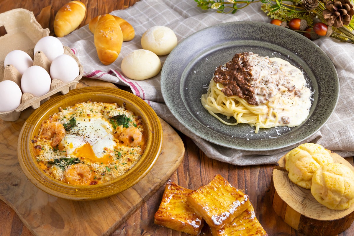(左)◆淡路島の北坂卵をのせた海老とほうれん草のトマトクリームパスタ グラタン仕立て