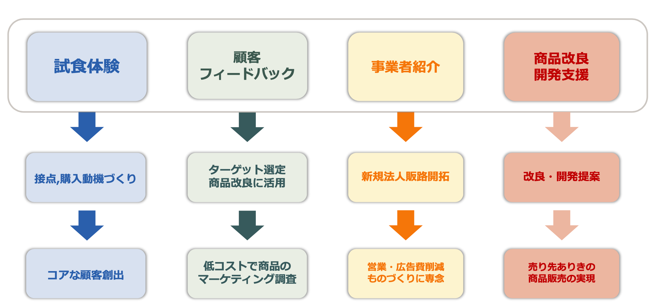 試食専門店試食屋は、企業の事業拡大支援のための総合的なサービスを提供しており、「試食専門店」という新しい業態におけるリーダーカンパニーとして、店舗OPENから約100社がサービスを導入。食品/ 飲料を製造・販売する企業の、商品PRからマーケティングリサーチ、商品開発プロデュースから販路(売り先)拡大支援までを一貫して「本質的な事業拡大支援」をすることができる新しいサービスです。(詳細:https://prtimes.jp/main/html/rd/p/000000007.000115518.html)