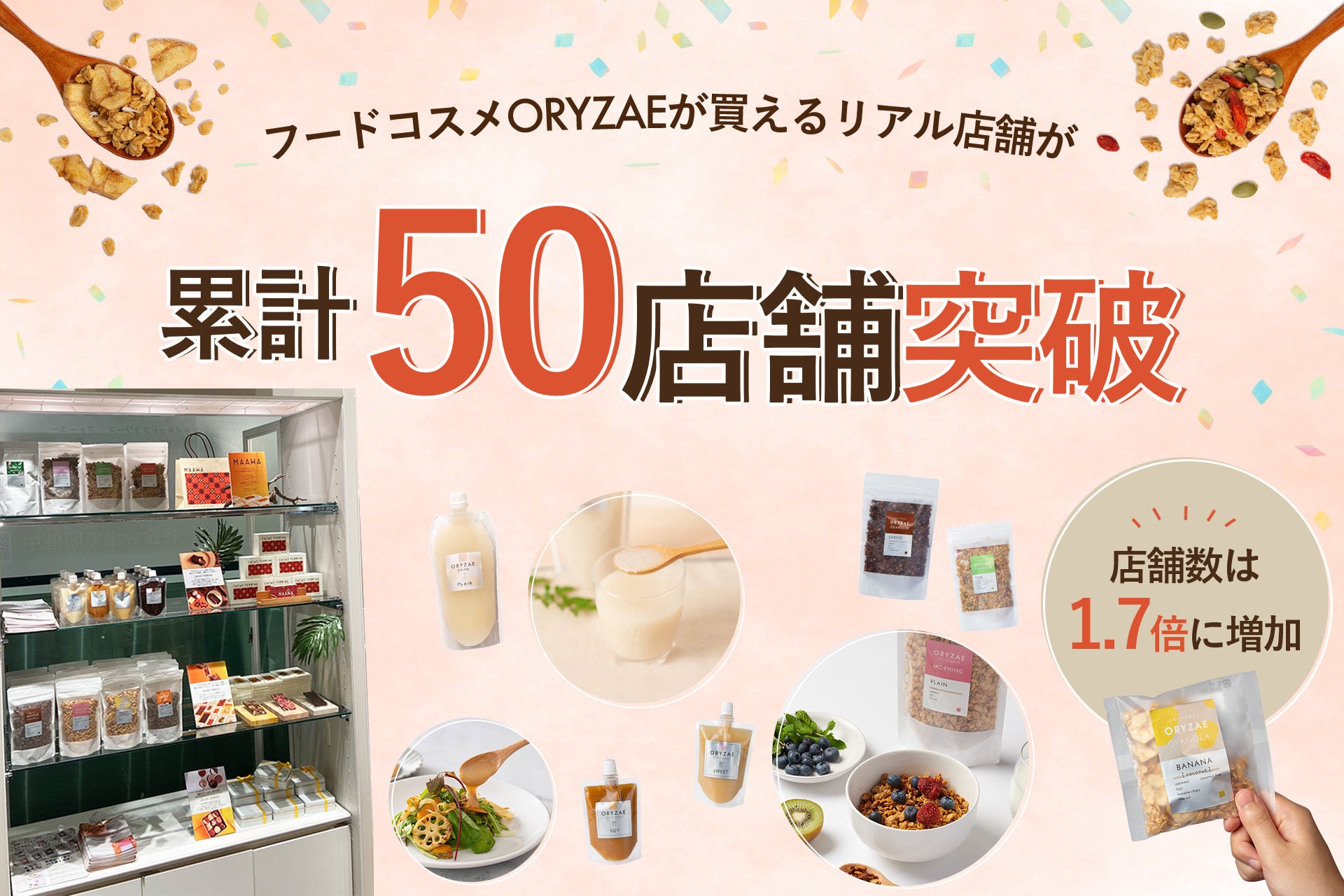 現在では、百貨店などの商業施設、アパレルストア、ライフスタイルショップ、カフェなどを中心に幅広い業態のリアル店舗にて、「フードコスメ ORYZAE」を実際に手に取っていただけます。