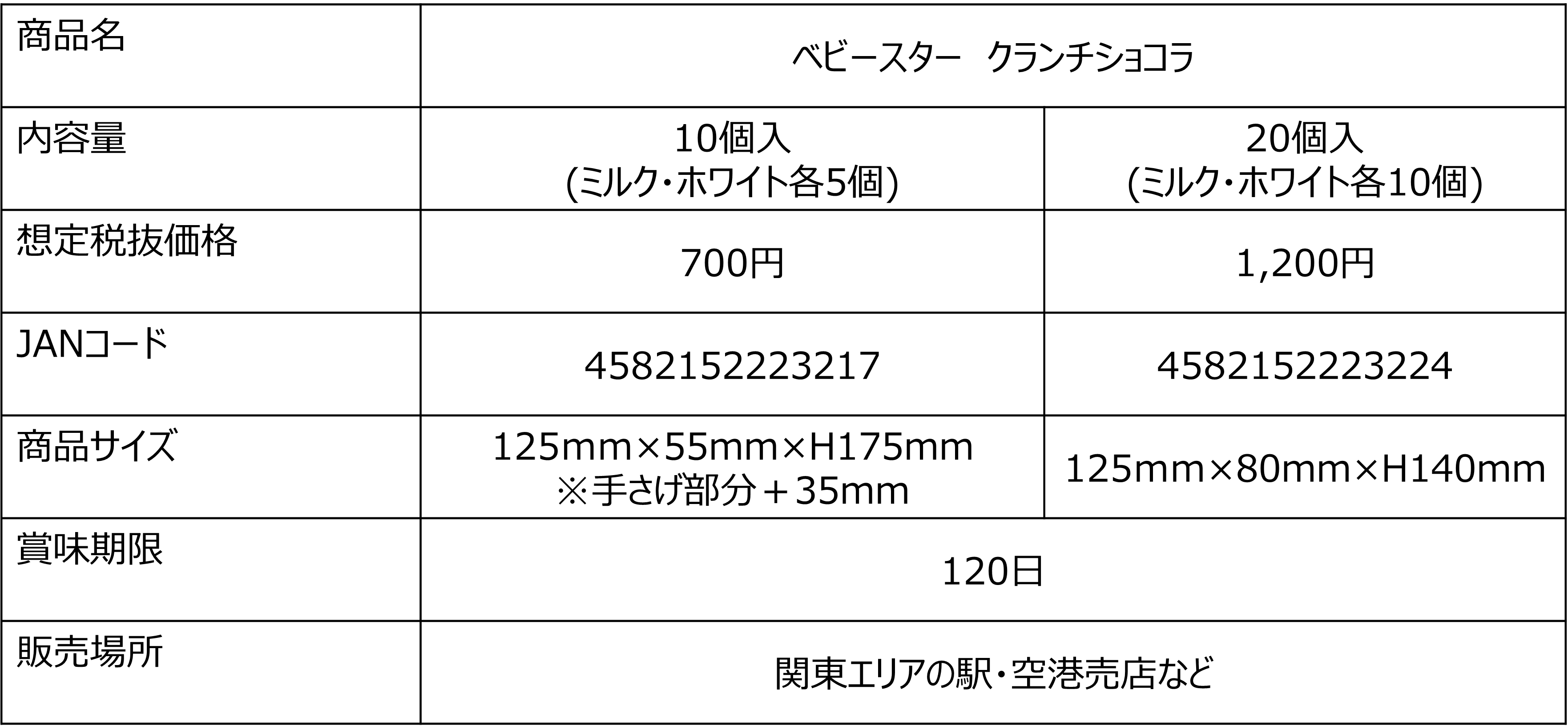 株式会社おやつカンパニーの「ベビースターラーメン」をクランチチョコレートにしました。みんなが大好きなベビースターラーメン チキン味にたっぷりのチョコレートをコーティングする事で、カリカリとした食感と、甘じょっぱい味わいが止まらない美味しさに仕上がっています。1箱でミルクチョコレートと、ホワイトチョコレートの2つの味わいが楽しめます。