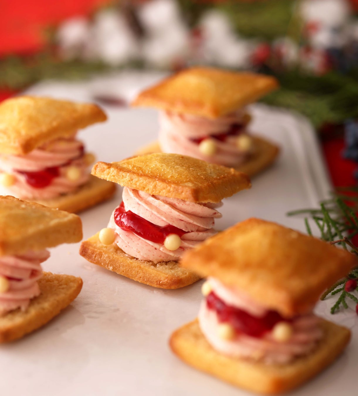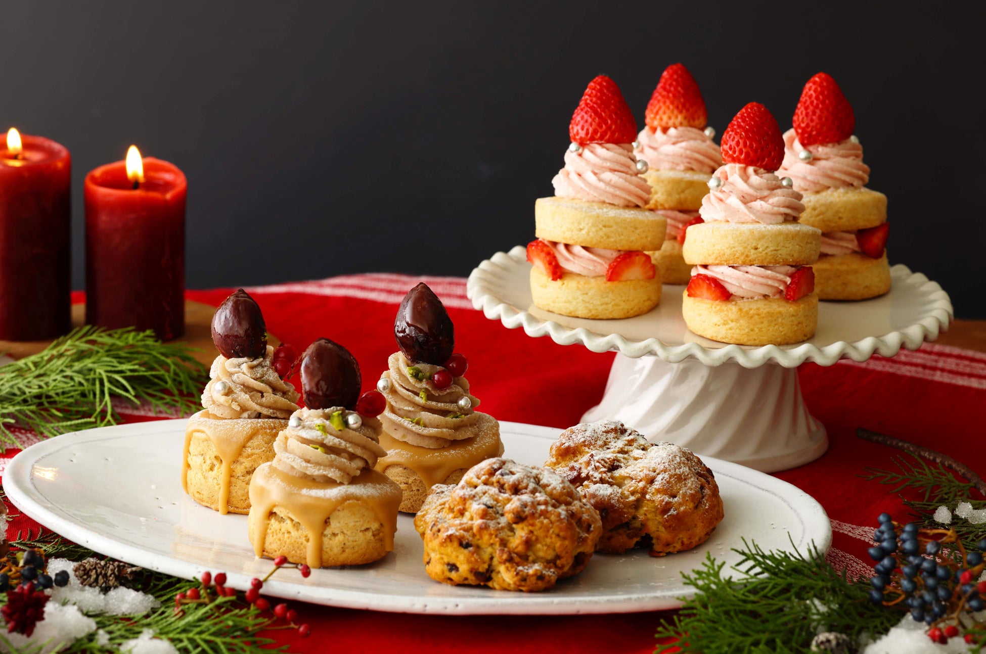 発酵バターを使用した特製あまおう苺バタークリームをサクほろ食感のスコーンでサンドし、ロウソクの炎に見立ててフレッシュ苺をのせたクリスマスのスペシャルスコーンサンド。