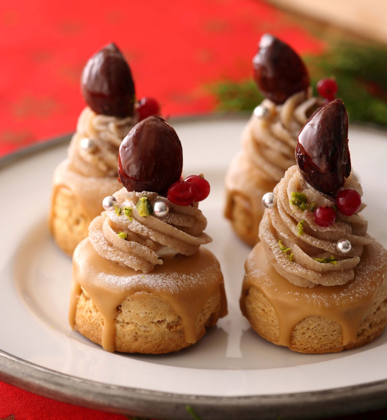 メープル&ピーカンナッツのスコーンにメープルアイシングをかけ、風味豊かな渋皮栗餡をモンブラン仕立てに絞り、渋皮栗をのせました。