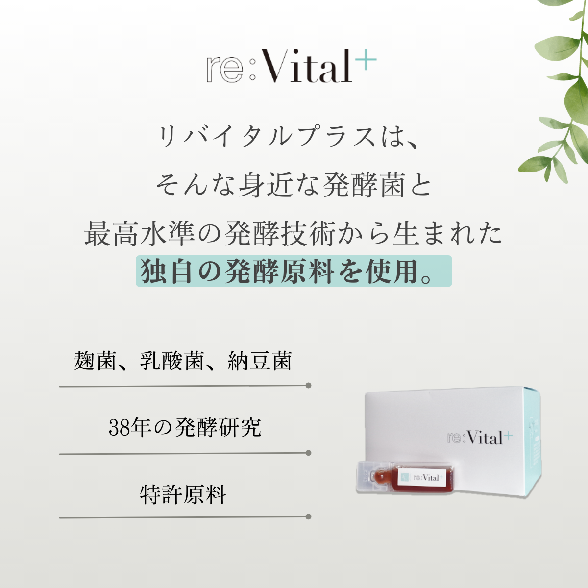リバイタルプラスは、麹菌、乳酸菌、納豆菌などの身近な菌と最高水準の発酵技術から生まれた独自の発酵原料を使用しています。この原料を開発するまでに38年かけられ、今では特許原料として注目されています。