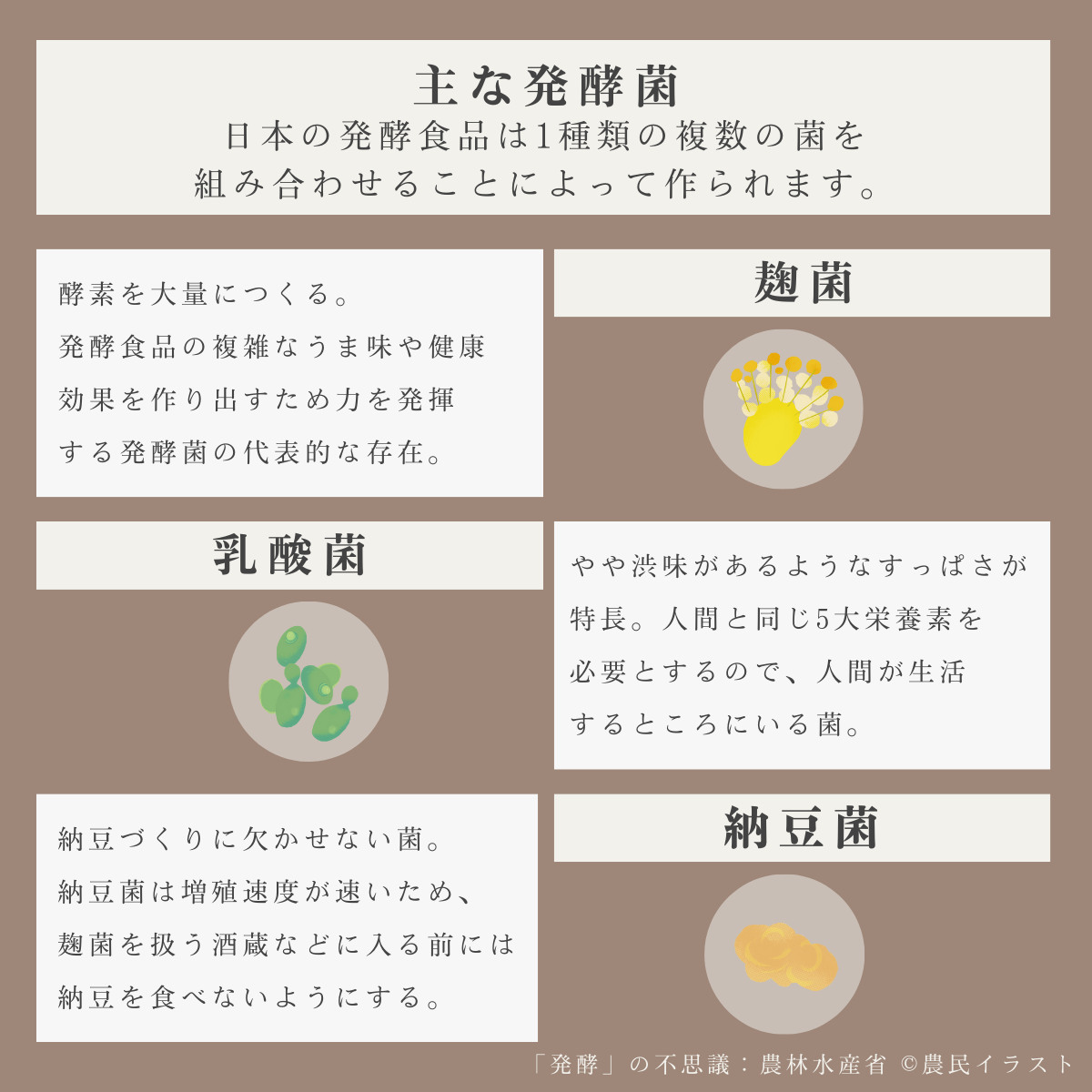 納豆菌などがあります。素材のうま味を引き出したり、発酵そのものが体の役に立ったり、それぞれの菌に