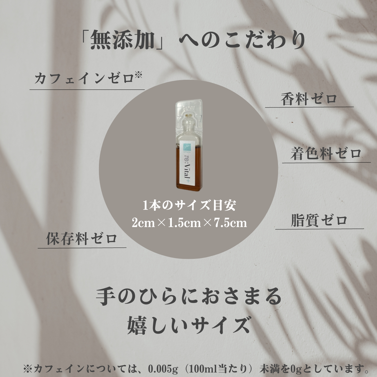 飲むことができます。さらに、毎日安心してお飲みいただきたいから、カフェイン※3、保存料、香料、着色料、脂質はゼロとして、「無添加」にこだわりました。