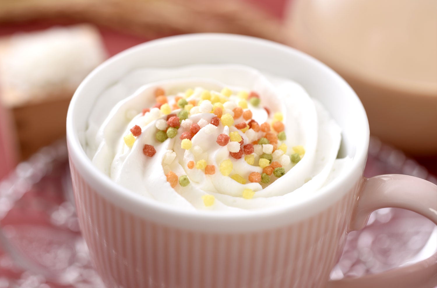 糀甘酒の優しい甘みと紅茶の風味が好相性で、ミルク感もたっぷりのあったかドリンクに仕上げました。ホイップクリームの上にトッピングした五色あられは見た目も可愛らしく、食感のアクセントにもなっています。
