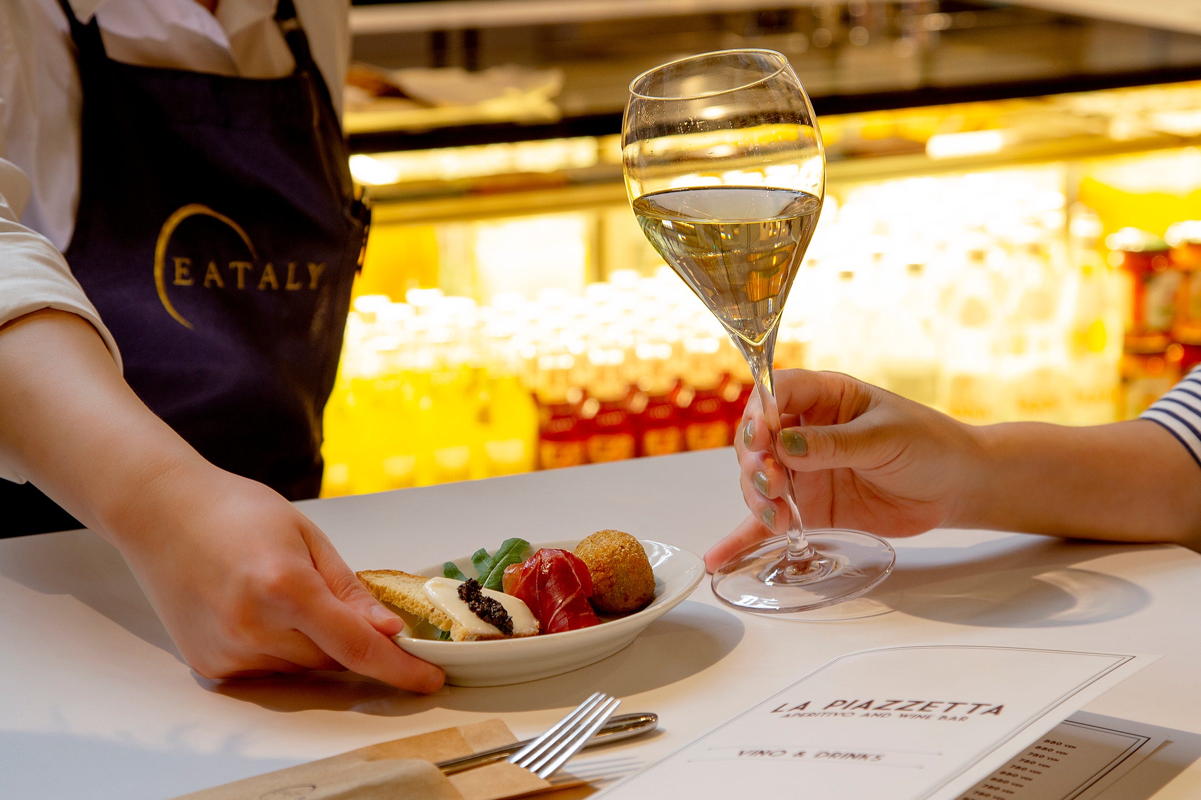 イータリー銀座店の中央に位置するアペリティーボ&ワインバー「LA PIAZZETTA」、丸の内、日本橋、原宿店のカフェ&カウンターでは、トリュフの香りを満喫するナターレ・アペリティーボメニューをご用意しております。