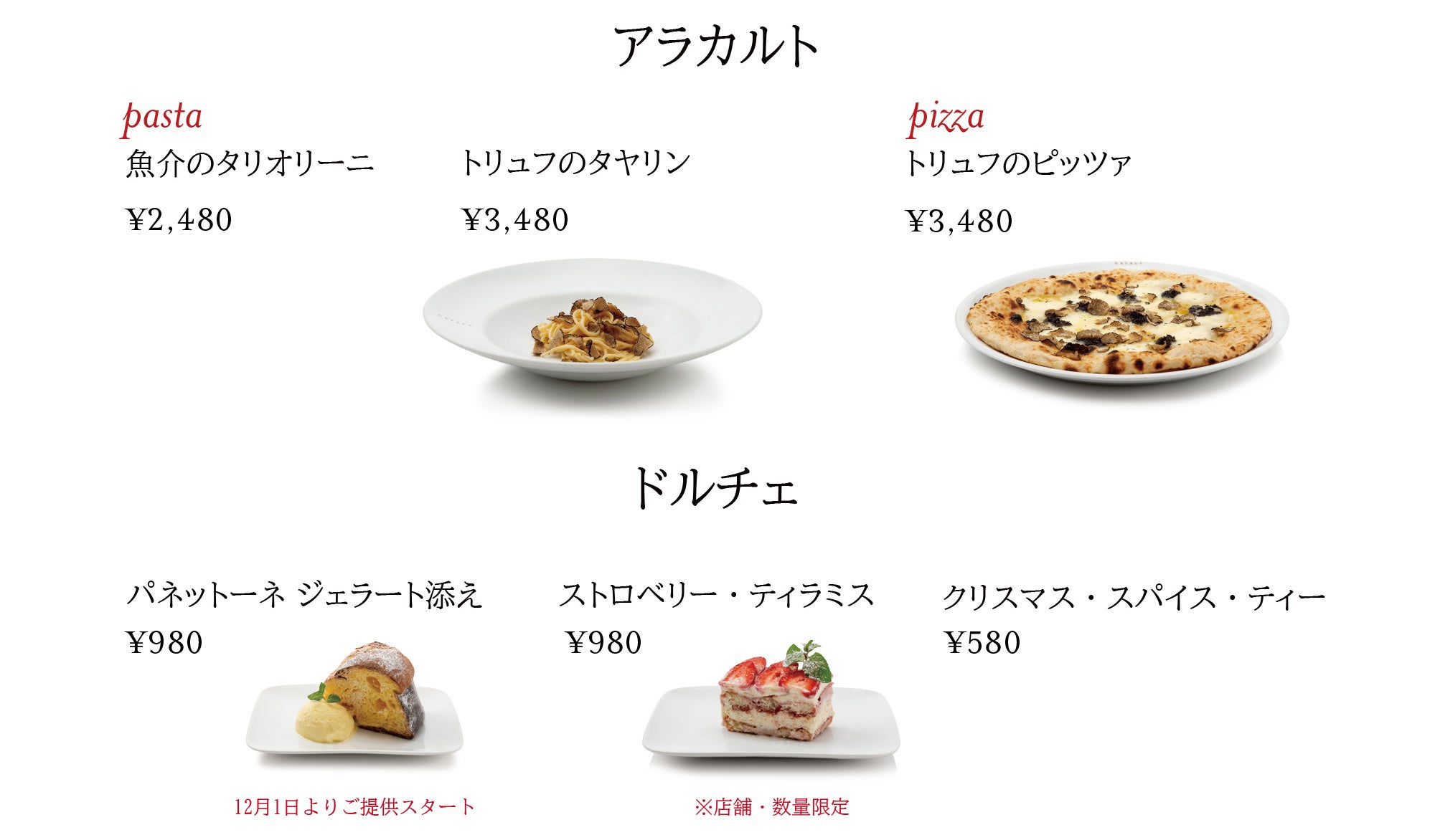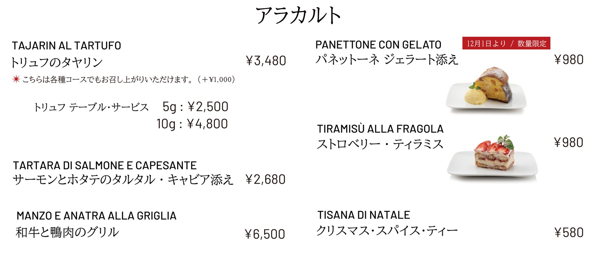 また、お好みに合わせて楽しめるアラカルトもございます。アラカルト限定でお楽しみいただけるトリュフのピッツァのほか、クリスマスならではのパネットーネもドルチェでお楽しみください(12月1日よりご提供開始)。