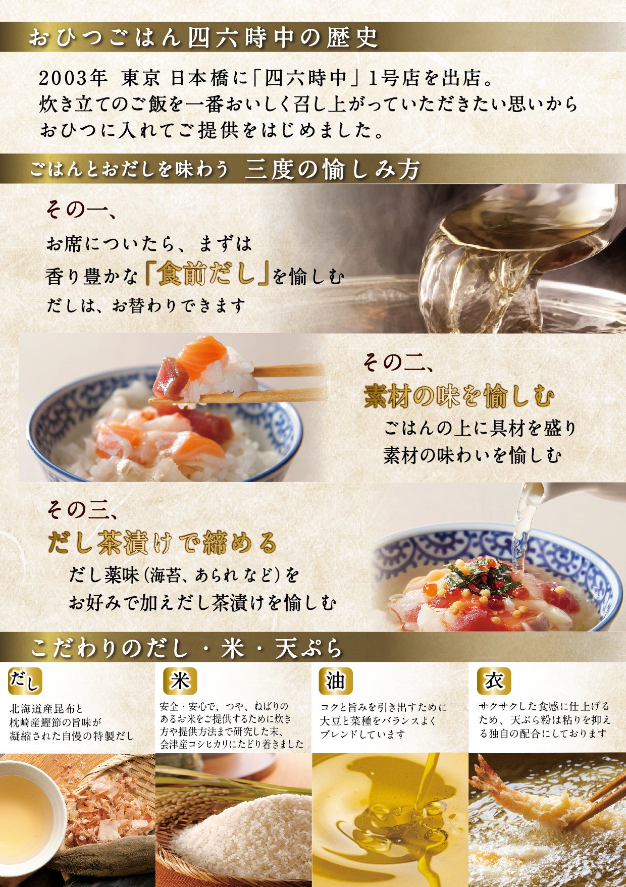 当社は、近年大きく変化した生活様式に対応すべく、レストラン事業の再編を進めており、当社主力業態である『おひつごはん 四六時中』へのリニューアルを推進しております。この度、その一環としてイオンモール久御山店に出店している『天ぷら和食処 四六時中』を『おひつごはん 四六時中』として11月15日(水)にリニューアルオープンいたします。