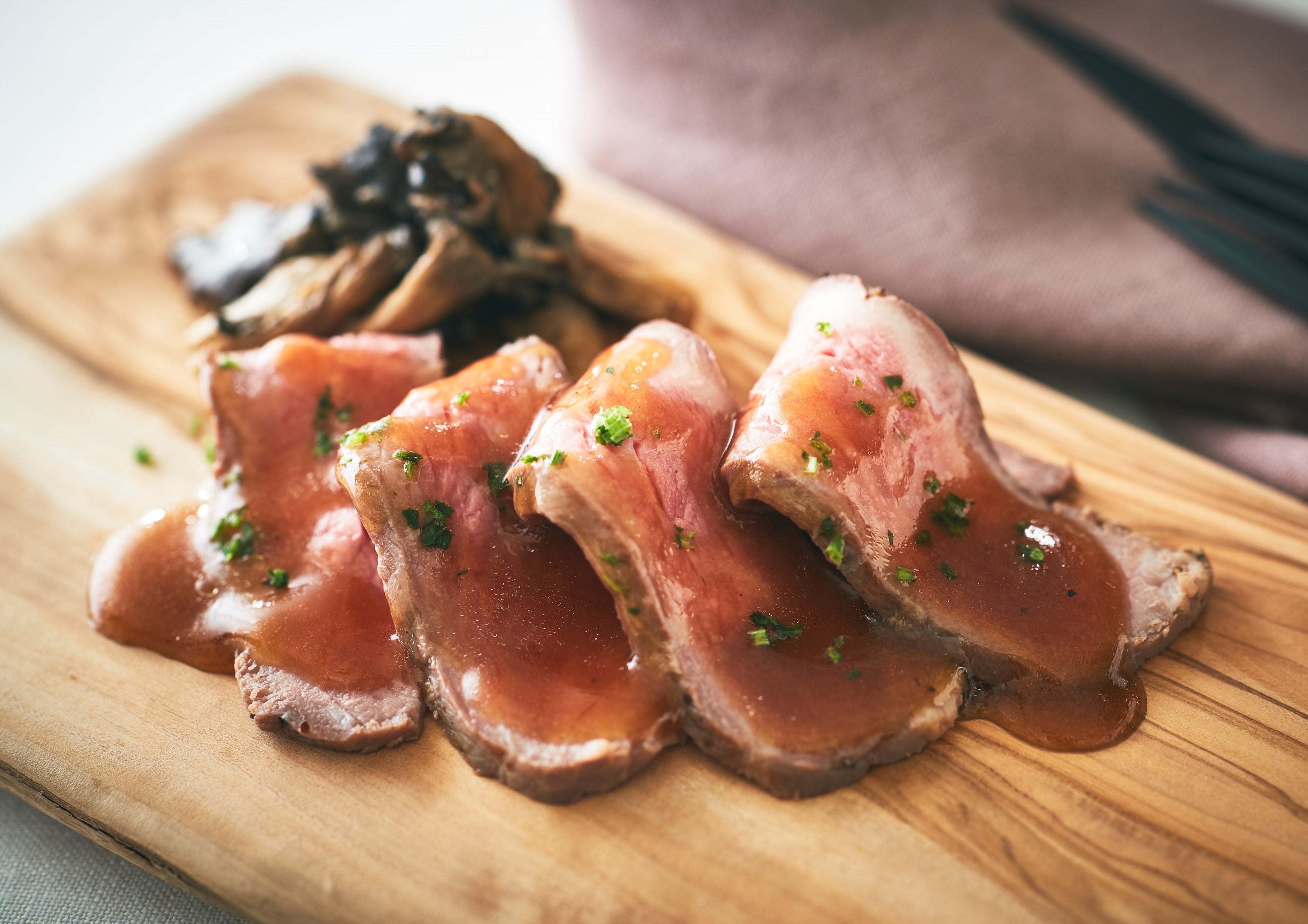 グリルした後にじっくりと加熱することで、表面の香ばしい香りと柔らかな食感、牛肉の旨みを引き出しました。まろやかな味わいのソースが、牛肉とローストした霜降りひらたけの味わいをより一層引き立てます。牛肉を贅沢に味わえるご馳走メニュー。