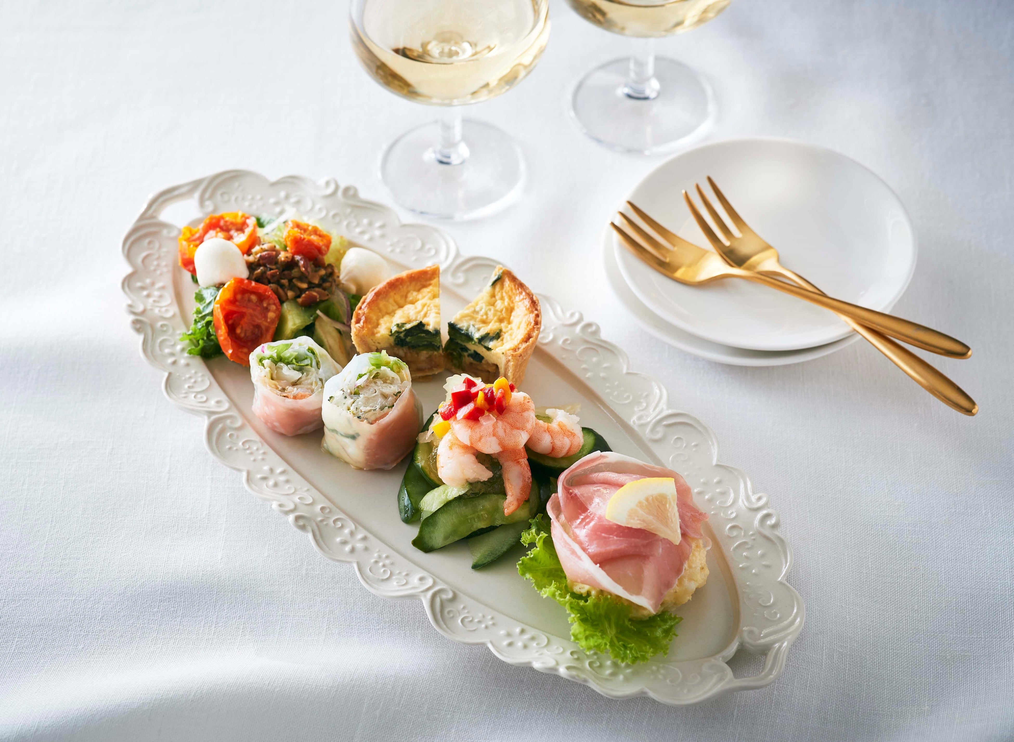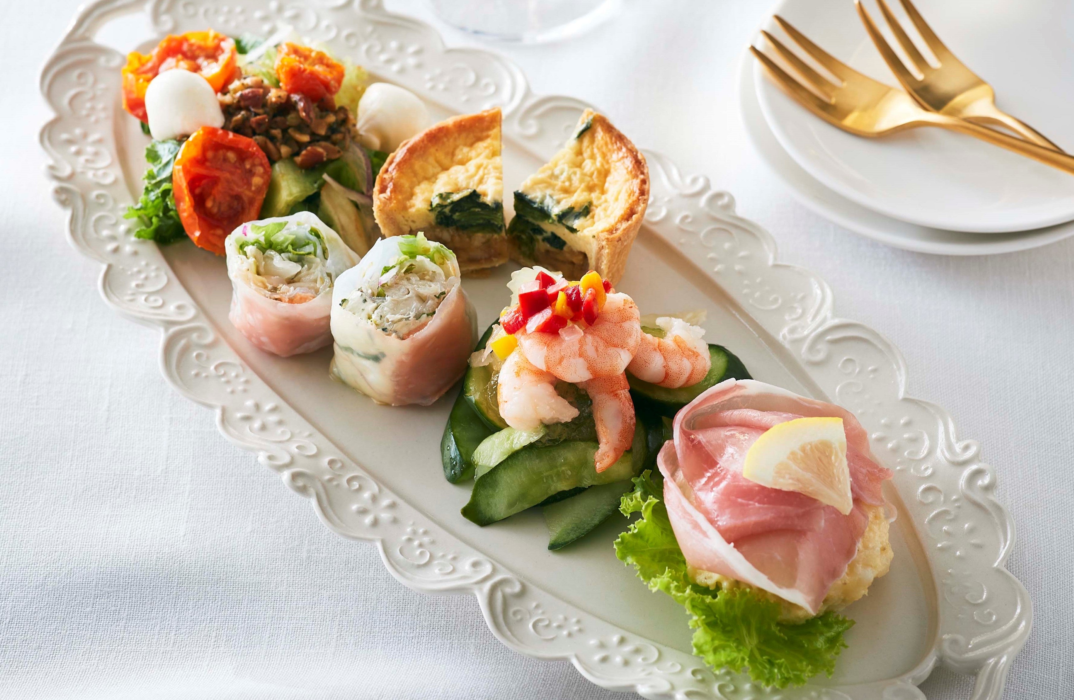 肩肘はらずに、ワインを愉しみたい時におすすめな、冷製オードブルの盛り合わせ。サラダや生春巻き、キッシュなど、少しずついろいろ味わえるのもうれしいポイントです。