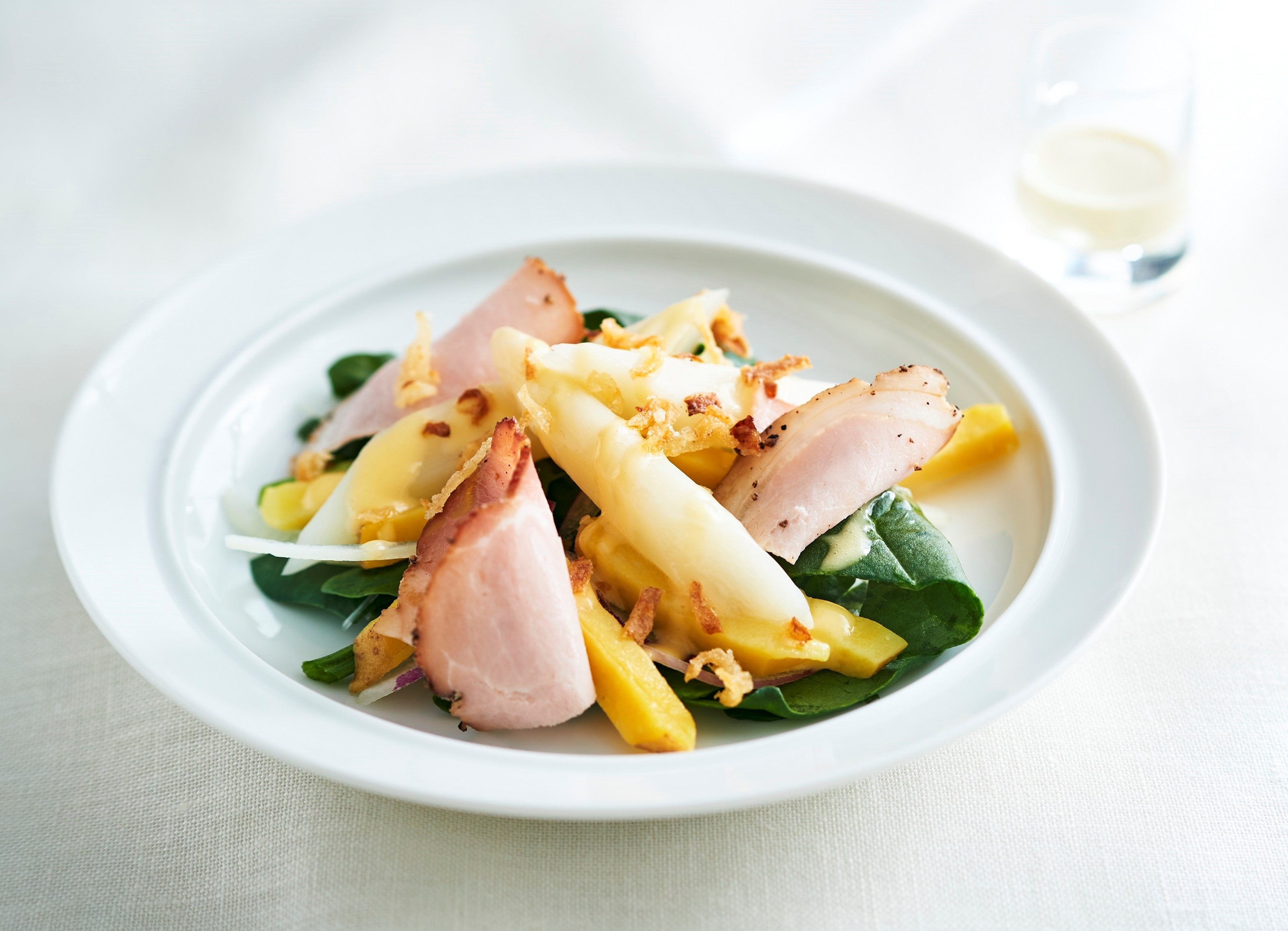 ほんのり甘いホワイトアスパラガスを使用。フランス職人直伝の黒胡椒ハムの旨みは、ホワイトアスパラガスの瑞々しさと相性ぴったりです。クリーミーでさっぱりとした、「オランデーズソース」をかけて、お召し上がりください。