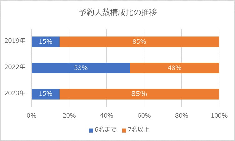 予約グループ人数は、7人以上の割合が2019年のコロナ前水準まで一気に回復。