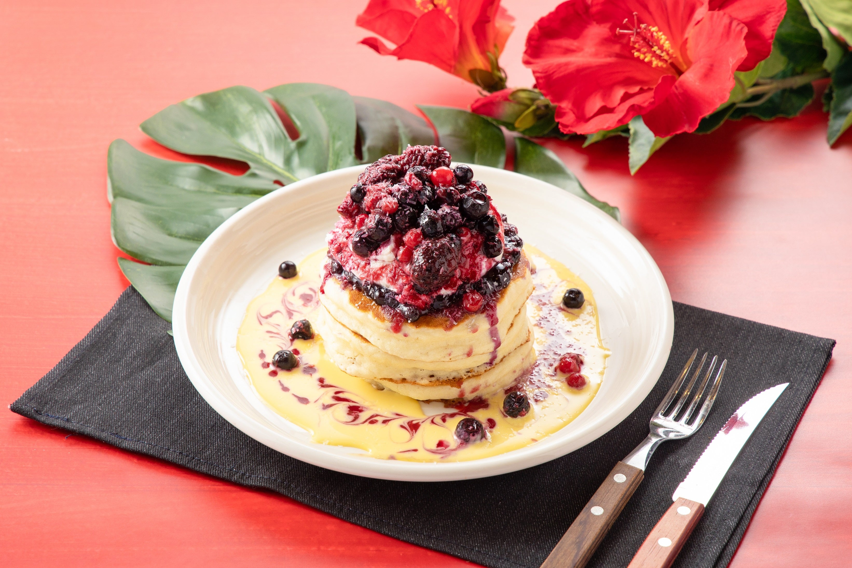 レアチーズケーキをイメージしたふわふわのチーズムースに、ゴロっと果実のミックスベリーソースを贅沢に使ったコナズ珈琲の新作パンケーキです。パンケーキの周りには、ココナッツが香るアングレーズソースをたっぷりと使い、ハワイ仕立てに仕上げたホリデーシーズン限定メニューです。
