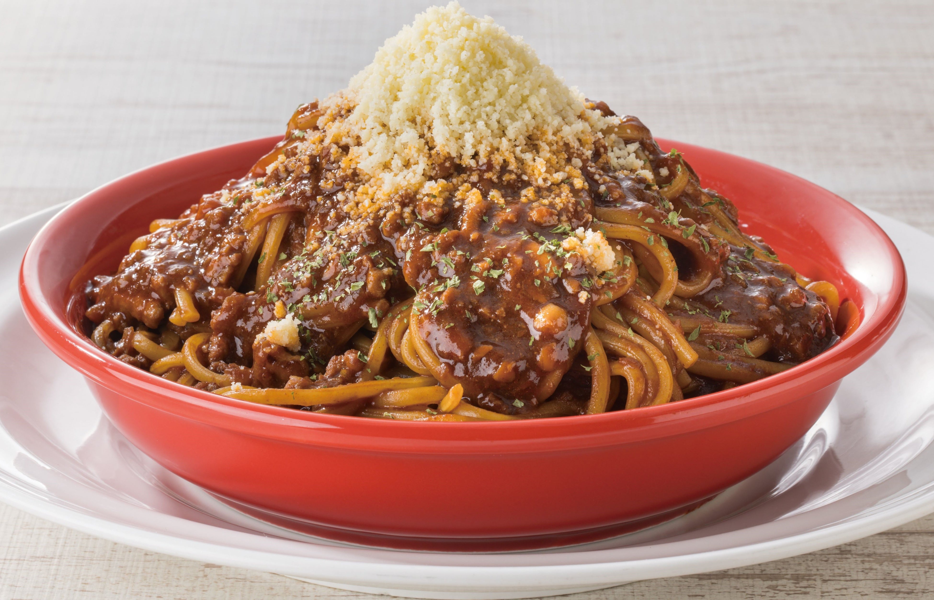 生パスタ2人前を富士山のように高く盛り付け、こだわりのコク深ミートソースと相性抜群の粉チーズの雪を降らせました。