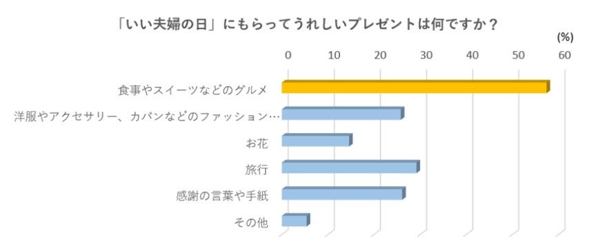 「いい夫婦の日」にもらってうれしいプレゼントの1位は「食事やスイーツなどのグルメ」(約57%)となりました。