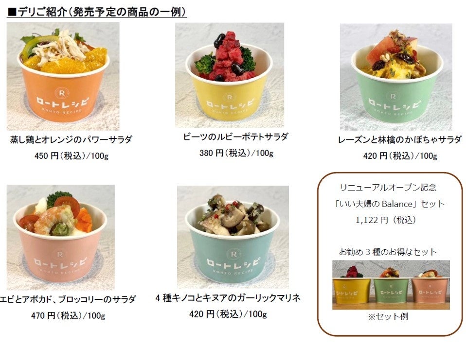 当社は2022年9月に、阪神梅田本店にある地下1階阪神食品館にて「ロートレシピ旬穀旬菜」をオープンしました。長年の研究によるハーブや隠し味にスパイスを加えて、旬の素材がゴロッと詰まった美味しいお惣菜をご提供しています。さらに2023年1月には、商業施設「NU茶屋町プラス」の2階に食の複合施設「ロートレシピ 梅田NU茶屋町プラス店」をオープンし、食事業のブランド「ロートレシピ」として「おなかの底から元気になれる」をコンセプトに、おいしく、健康的で、サステナブルな食事をご提案しています。ロートレシピ茶屋町店での一番の人気は、季節に応じて変わるデリプレートです。旬の食材を季節や体調に合わせた栄養バランスで、見た目の楽しさにもこだわったオリジナルデリを、さらに多くの方にさまざまな場所でお召し上がりいただけるように、阪神梅田本店にある地下1階阪神食品館でも「ロートレシピ」のデリ(お惣菜)テイクアウト専門店としてオープンいたします。ご自宅で、またお出かけの際のお食事をさらに彩り豊かに、また身体の源をつくる食から健康をサポートしていきます。
