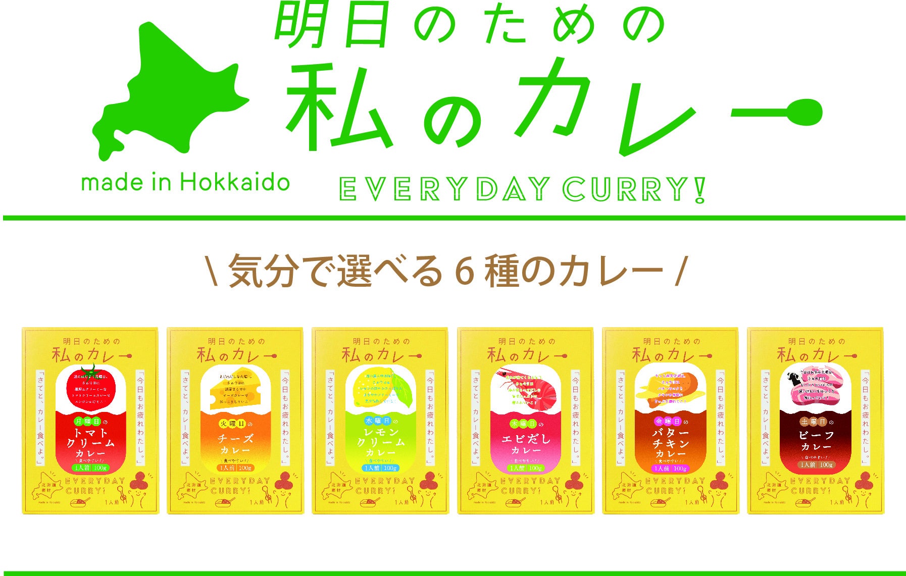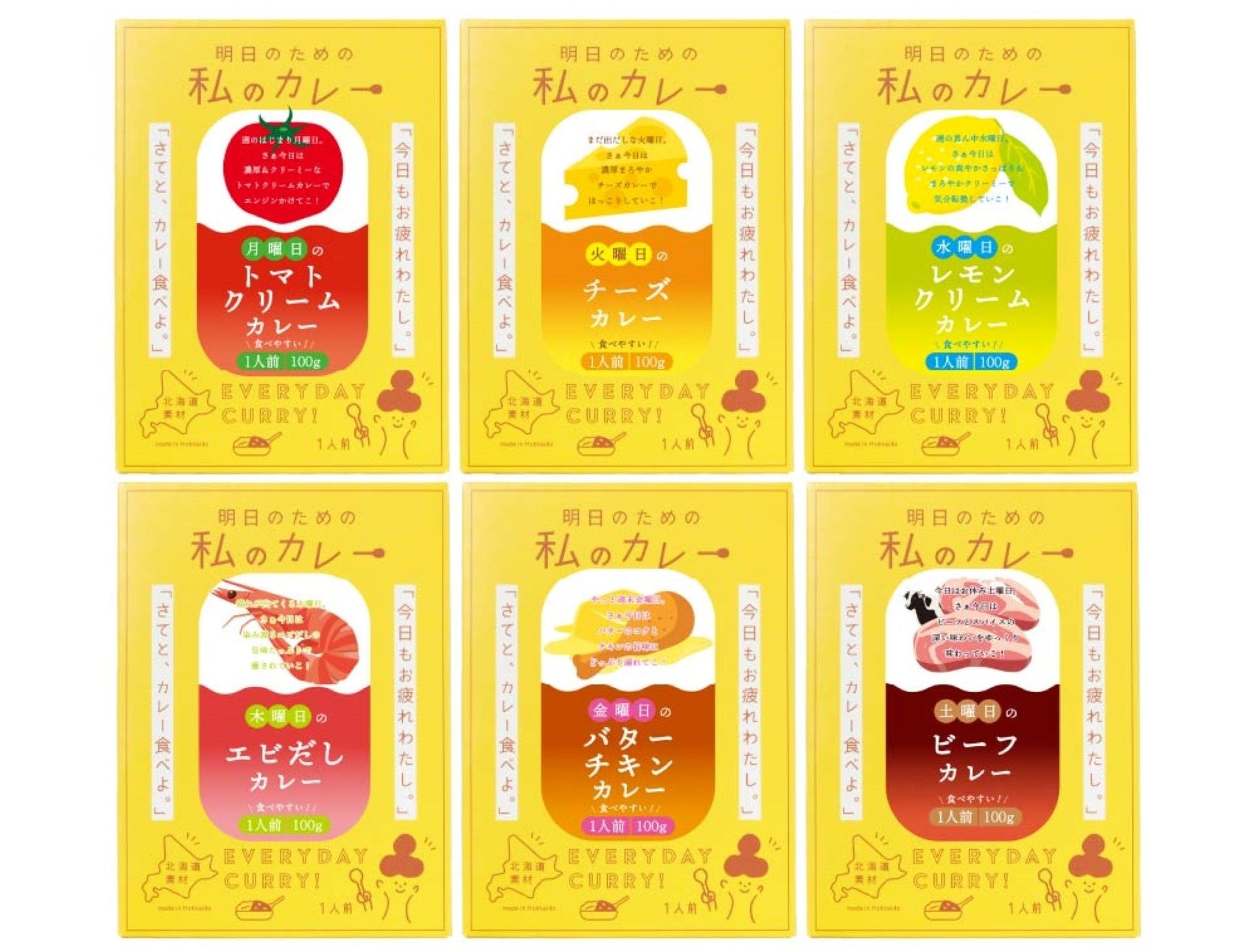 そんな想いでこだわり抜いた「明日のための私のカレー」は全部で6種類。北海道産の食材をたっぷり使用した食べ切りサイズ、内容量100gのレトルトカレーです。