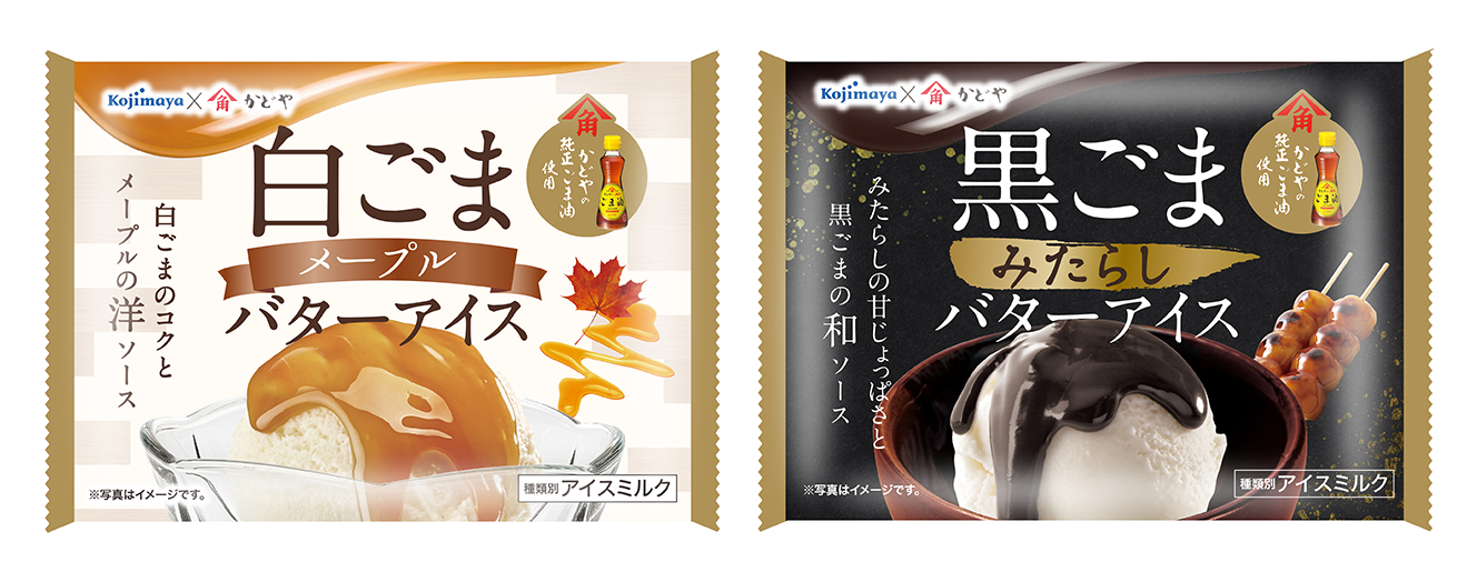 「かどやの純正ごま油」を使用したバターアイスに、煎ってから練り上げる事でごま本来の香りが楽しめる「かどやのねりごま」を使用した異なる風味のソースを合わせました。