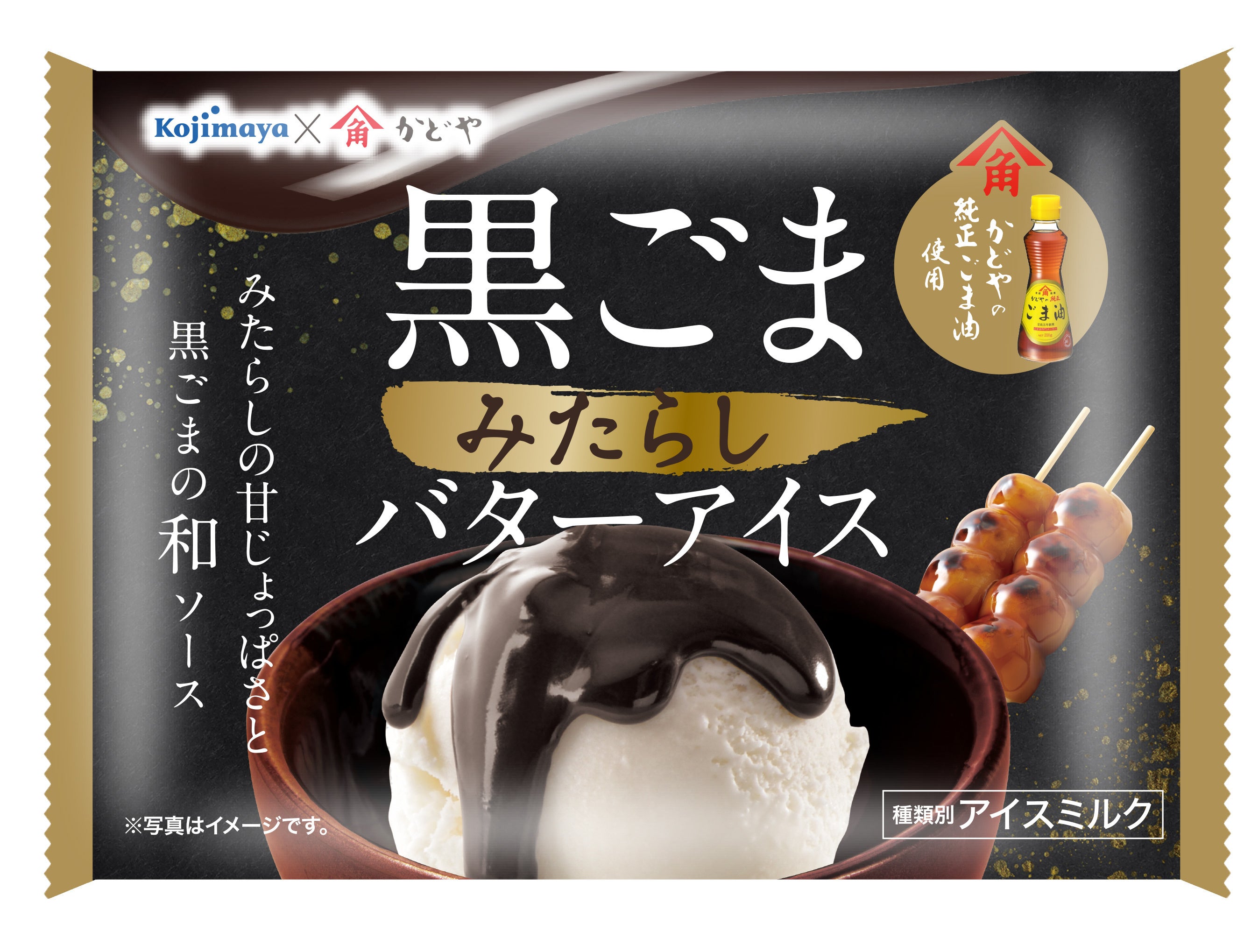 ごま油入りバターアイスに「かどやのねりごま(黒)」とみたらし風味の和風ソースを合わせました。