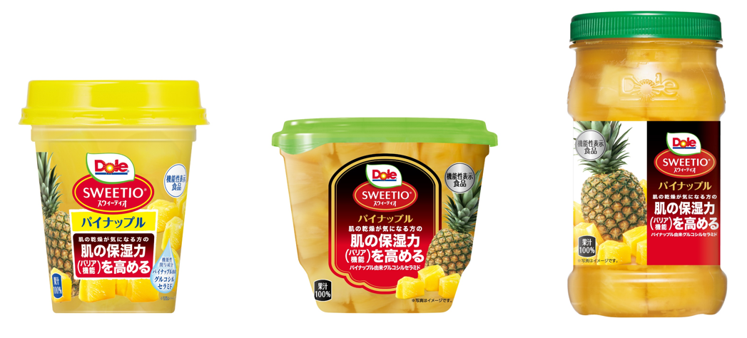 「スウィーティオパイナップル」に含まれる「パイナップル由来グルコシルセラミド」は肌の保湿力(バリア機能)を高めることが報告がされており、これを機能性関与成分として、フルーツそのものを使ったフルーツ加工食品として初めて※機能性表示食品の届出を行いました。1日の摂取目安量100gをお召し上がりいただくことで「パイナップル由来グルコシルセラミド1.2mg」が摂取できますので、手軽で効率的に乾燥肌対策が行えます。