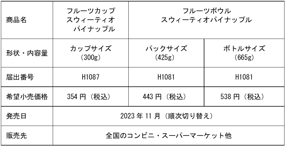 「スウィーティオパイナップル」は、日本人の味覚に合わせて開発され、酸味が少なく豊潤な甘さが特徴です。この「スウィーティオパイナップル」をそのままカットし、100%果汁と共にカップに詰めた「フルーツカップ」は、いつでも安定したパイナップルの味わいを楽しめる手軽なフルーツアイテムです。