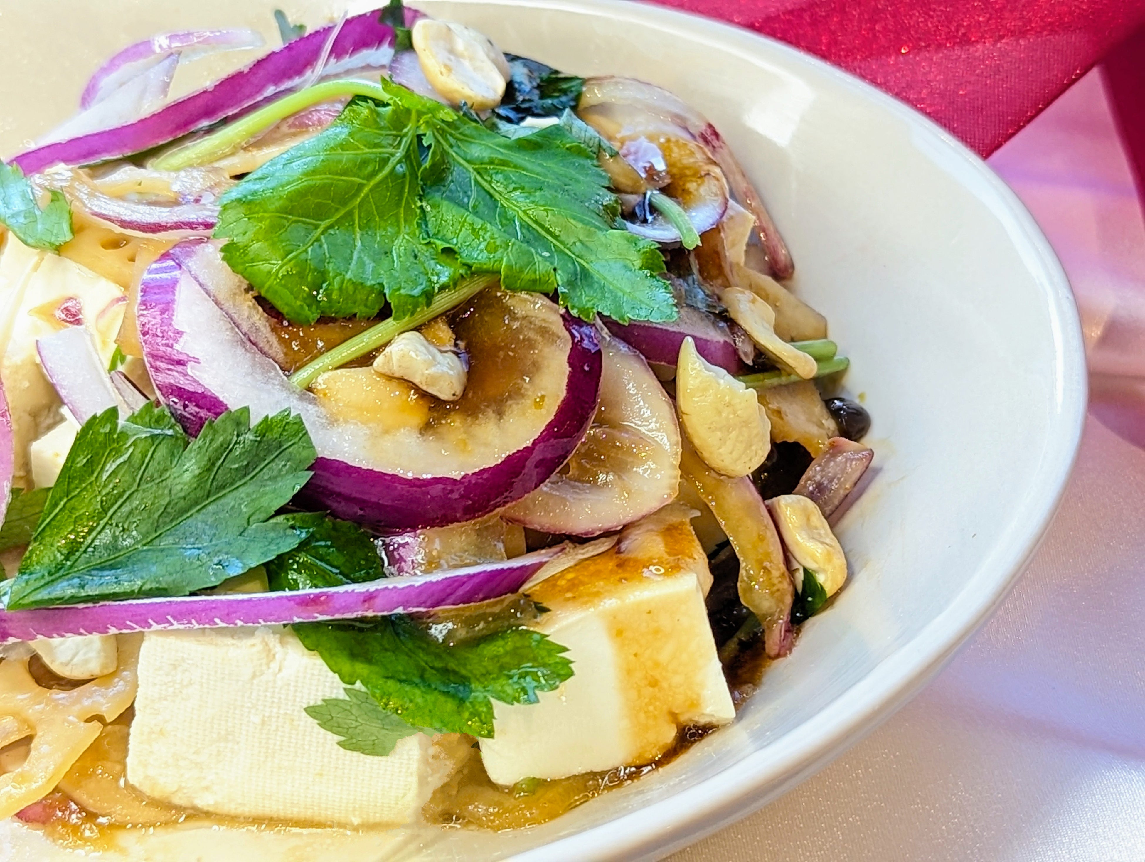 蓮根やカシューナッツの食感が楽しく、三つ葉の爽やかな香りが広がります。柚子胡椒のピリッとした風味のソースがナッツの甘さを引き立て、豆富とよく合います。