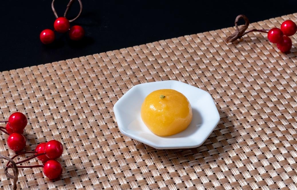 可愛らしいみかんの形をしたモチモチ食感の白餡入りのお団子。爽やかなみかんの風味が香ります。