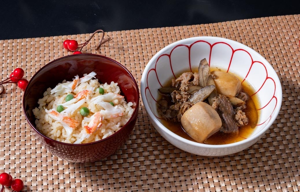 この度、nonpi foodbox® for onlineの人気シリーズ高級和食の老舗「神田明神下みやび」とのコラボレーション商品から、冬の味覚の食材をふんだんに使用した、冬季限定のプランをご用意しました。旬の食材をふんだんに使用し彩り華やかに仕上げた9種アラカルトの他、寒い時期に心も身体も温まるお酒が進む味付けの「芋煮風煮込み」、〆に冬の味覚の本ずわい蟹を使用した「かに飯」を。甘味には冬が旬の可愛らしいみかんの形をした「みかん餅」をお付けしました。