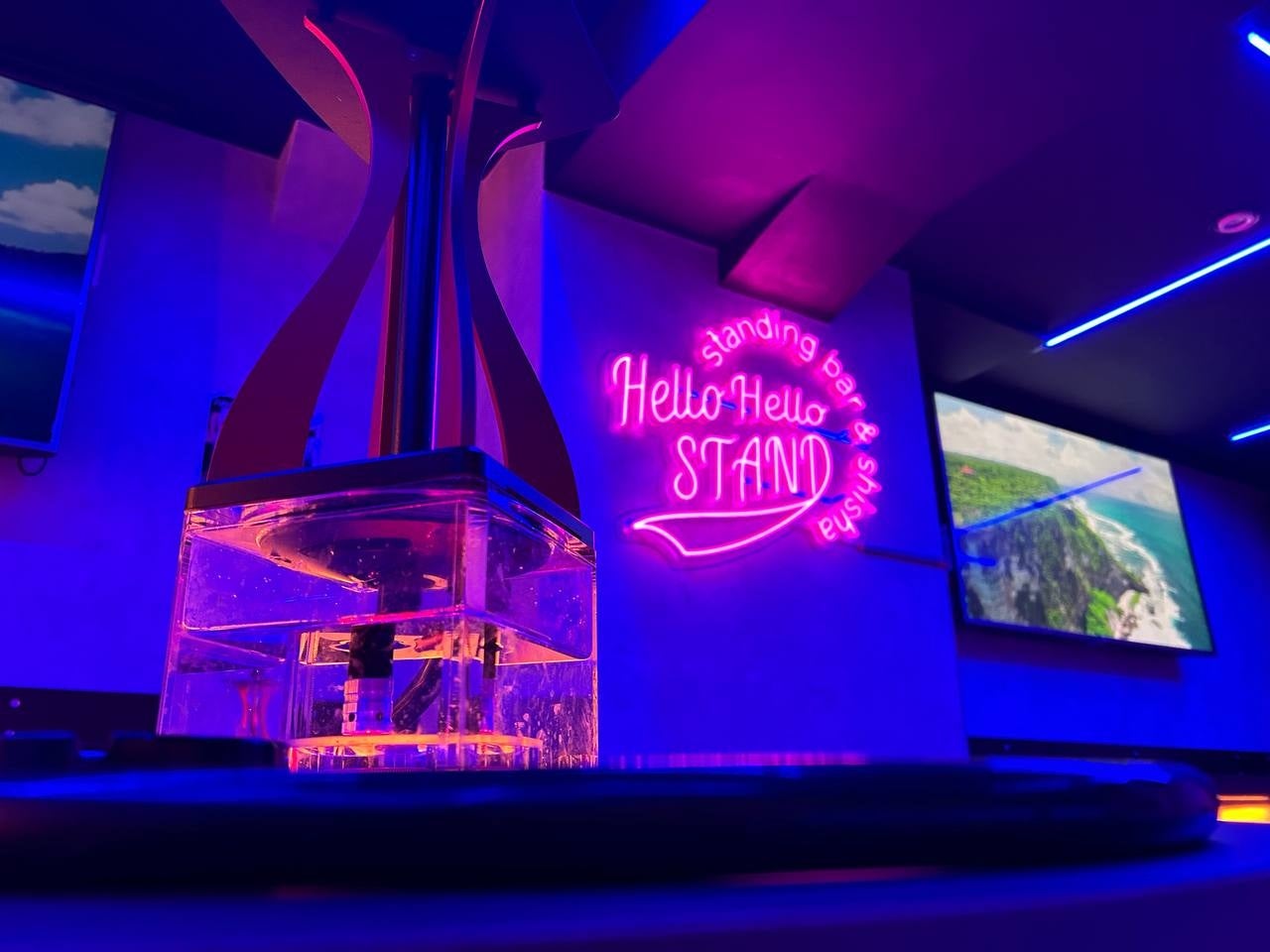 「Hello Hello STAND」は、“銀座の秘密基地”をコンセプトに、「お酒」「音楽」「シーシャ」を融合した特徴的なスタイルのスタンディング・シーシャバーです。お客様同士が出会い、繋がり、ご縁が広がることで日本を活性化させたいという想いから誕生しました。海外のスタンディングバーの様に気軽に「Say Hello」と言える明るい場になるよう、「Hello Hello STAND」という店名を採用しました。