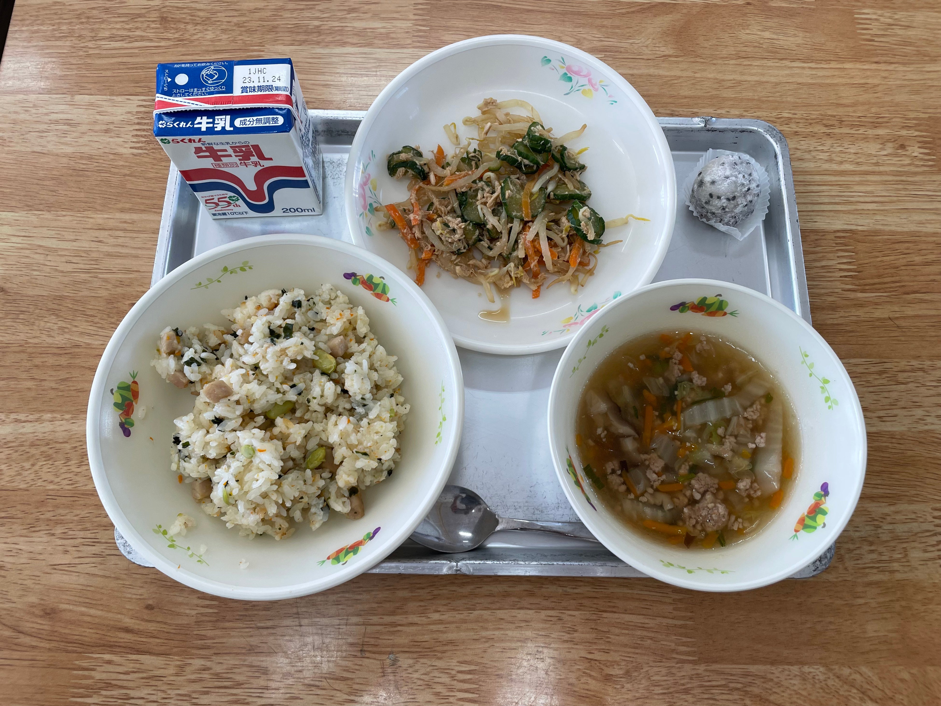 献立 :中華風わかめごはん(白ごま、ごま油使用)、バンバンジー(練りごま、ごま油使用)