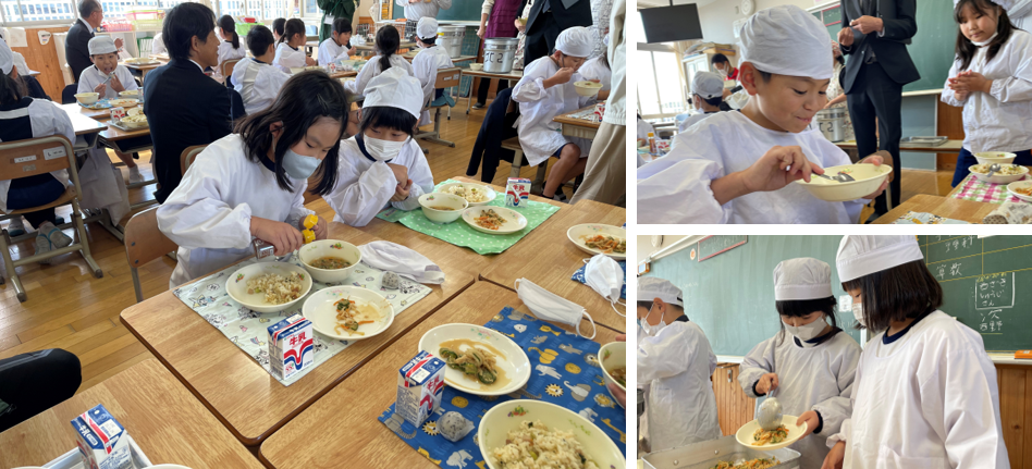 「“ごま”んぞく給食」は、白ごま・ごま油が使用された「中華風わかめごはん」、練りごま・ごま油が使用された「バンバンジー」、純正ごま油やごま油で作られたラー油をかけて楽しむ「春雨スープ」、地元の老舗和菓子店「池本芳栄堂」とコラボした「黒ごま入りだんご」が提供されました。食事を楽しんだ子どもたちからは、「バンバンジーが一番美味しかった!」「また食べたい!」といった言葉があがり、笑顔に包まれていました。子どもたちが楽しむ姿を前に、かどや製油マーケティング推進部の安田さんは、「子どもたちが食育授業の段階から非常にごまに興味をもってくれて、得た知識を給食という形で体感し学びが繋がっていく様子を間近で見て、今回の取り組みは非常に意義のある活動だったと感じています。」と話しました。