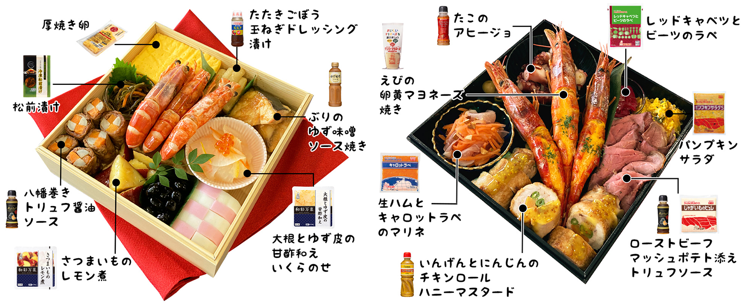 今回は、素材本来の美味しさを引き立たせる定番メニューや、明るく華やかな見た目がお正月の晴れやかな気分を盛り立てるアレンジメニューなどを、手軽に作れる商品をピックアップ。常温・冷蔵商品と、冷凍商品のそれぞれで、お好きな商品を 3点以上ご購入で5%オフになるお得なセールです 。