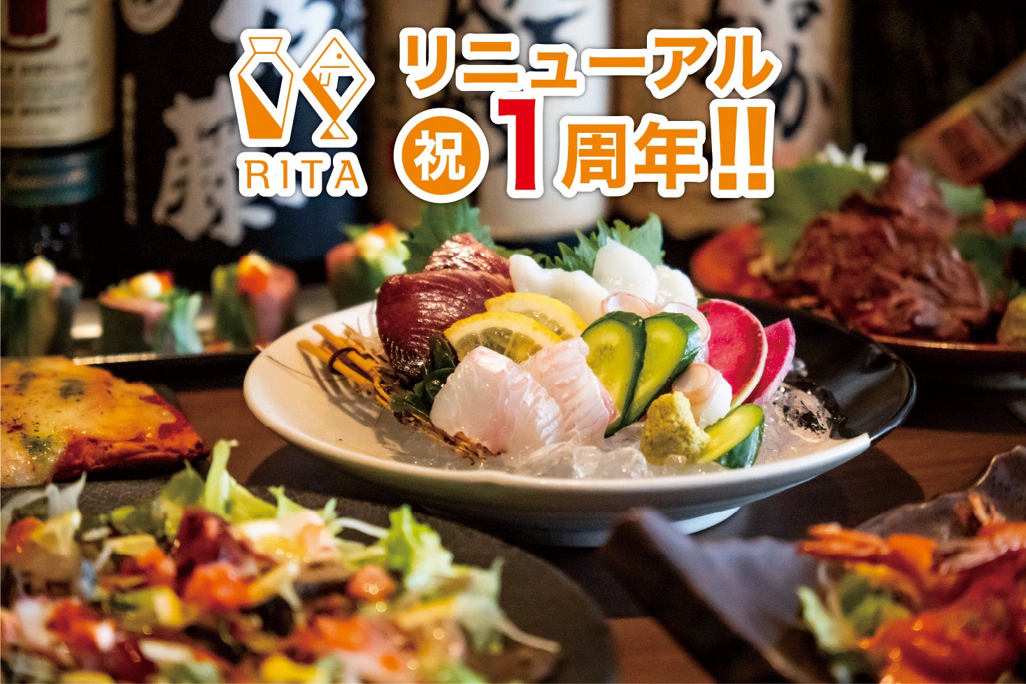 無事にリニューアル1周年を迎えたことを記念しファーストドリンク無料、3名様以上でコース料理ご注文の方は飲み放題制限時間30分追加(通常90分が120分)サービスを実施いたします。