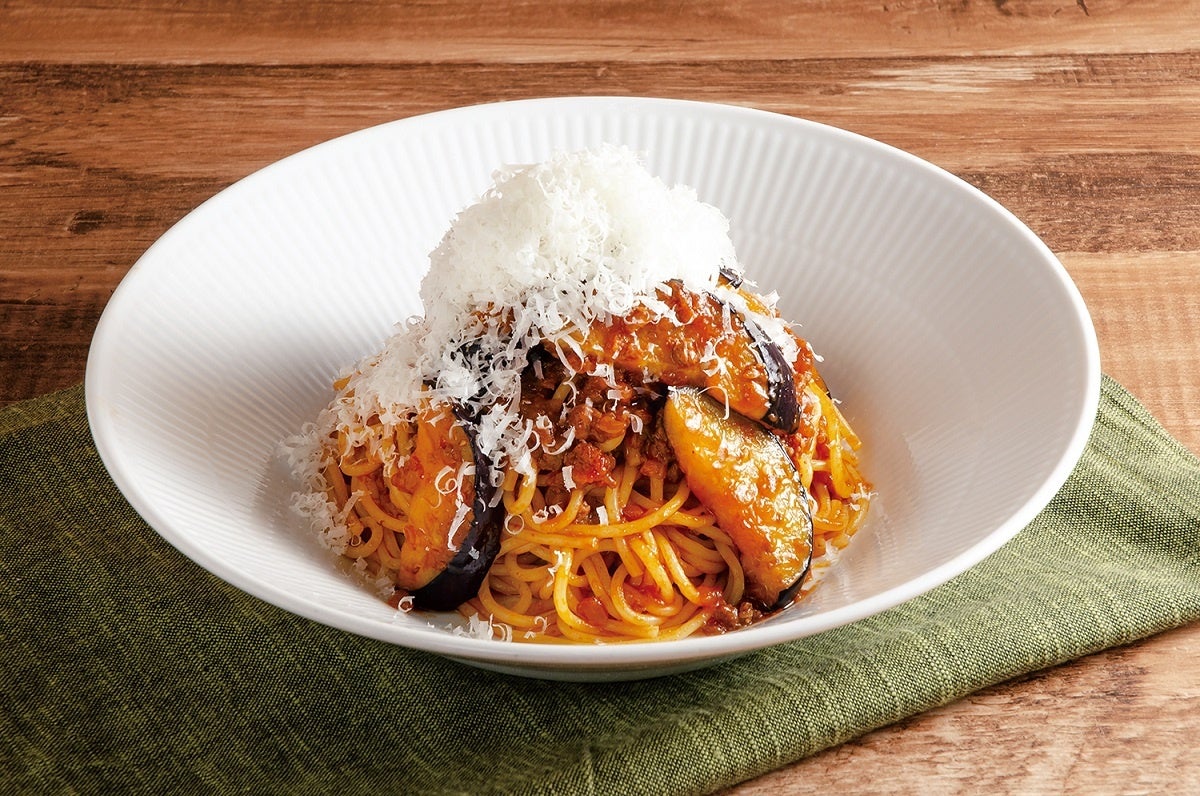 みずみずしいなすをたっぷり盛りつけた自慢のミートソースパスタ。