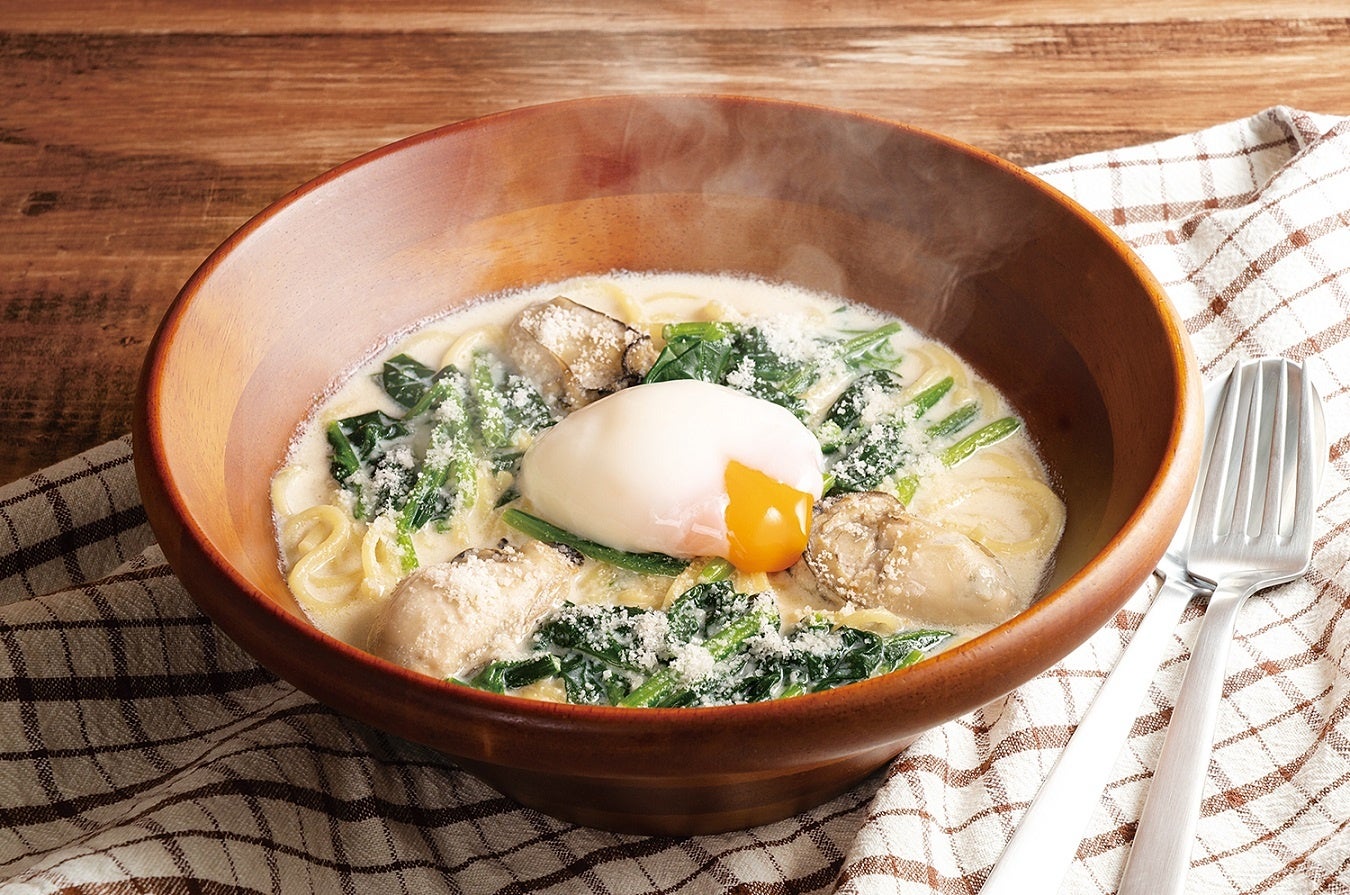 濃厚な旨みが凝縮された広島県産の大粒牡蠣を贅沢に味わえる、豆乳のやさしい甘みが体に沁みわたるスープパスタ。
