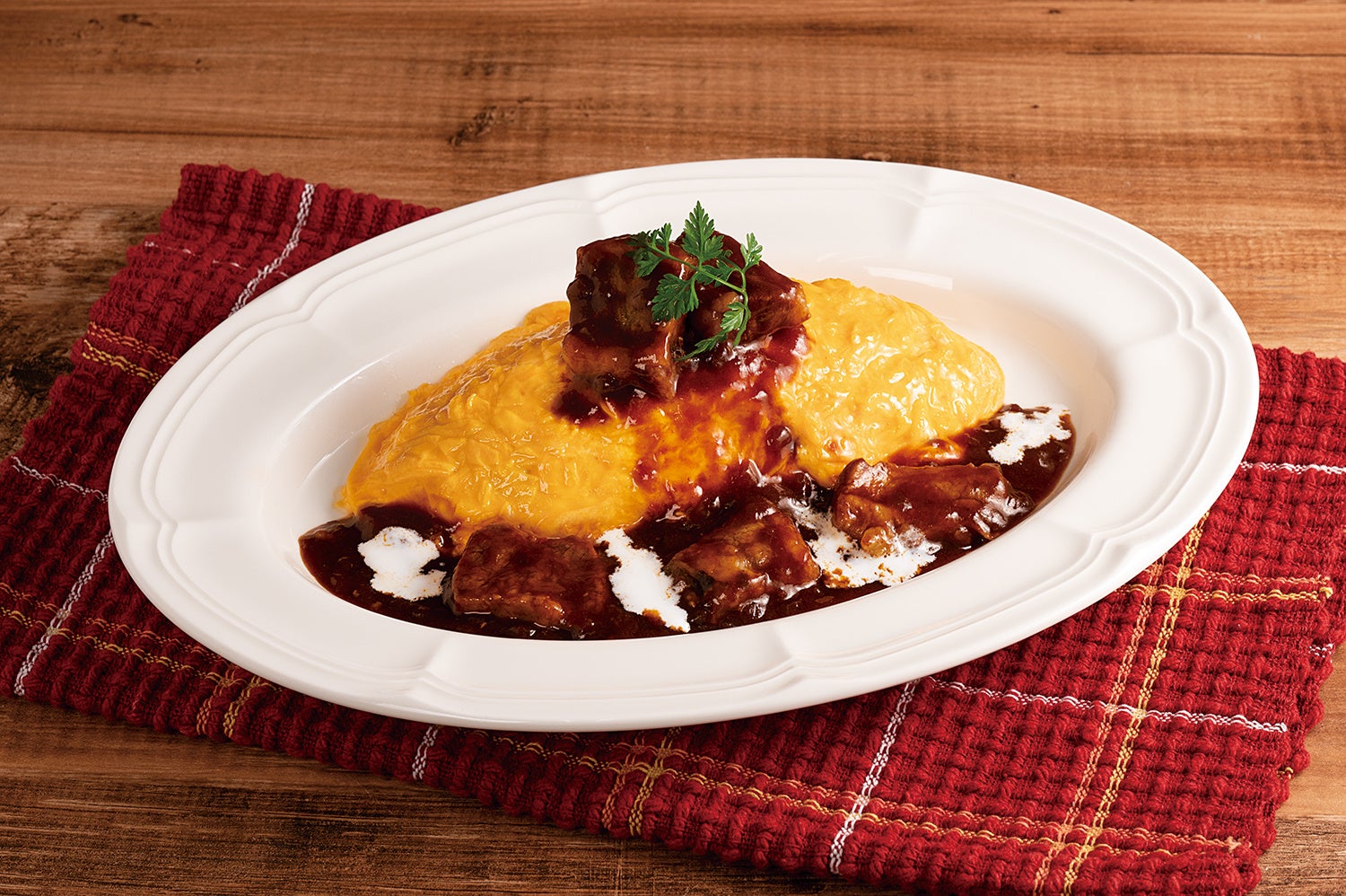 ふわとろの卵で包んだオムライスに、じっくり煮込んだほろほろの牛肉が堪らないビーフシチューをたっぷりとかけて仕上げました。