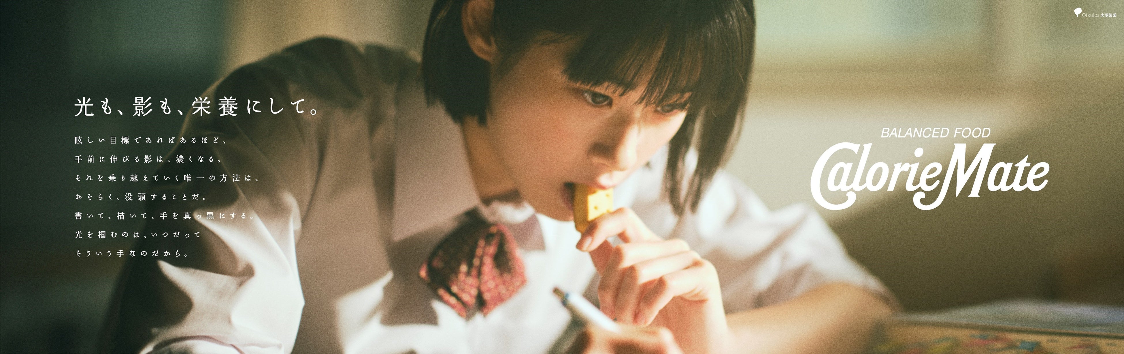 本CMには、文系や理系といった学部ではなく、美大を目指す受験生が初めて登場します。多様化した受験スタイルを描きつつも、まわりを見て焦る姿や、仲間と励まし合いながらひたすらに進む様子など、どんなに環境が変わっても、なりたい自分になるために努力をする高校生の普遍的な姿を描きます。夢に向かって「没頭」する人達を支える存在として、カロリーメイトが2人に寄り添います。