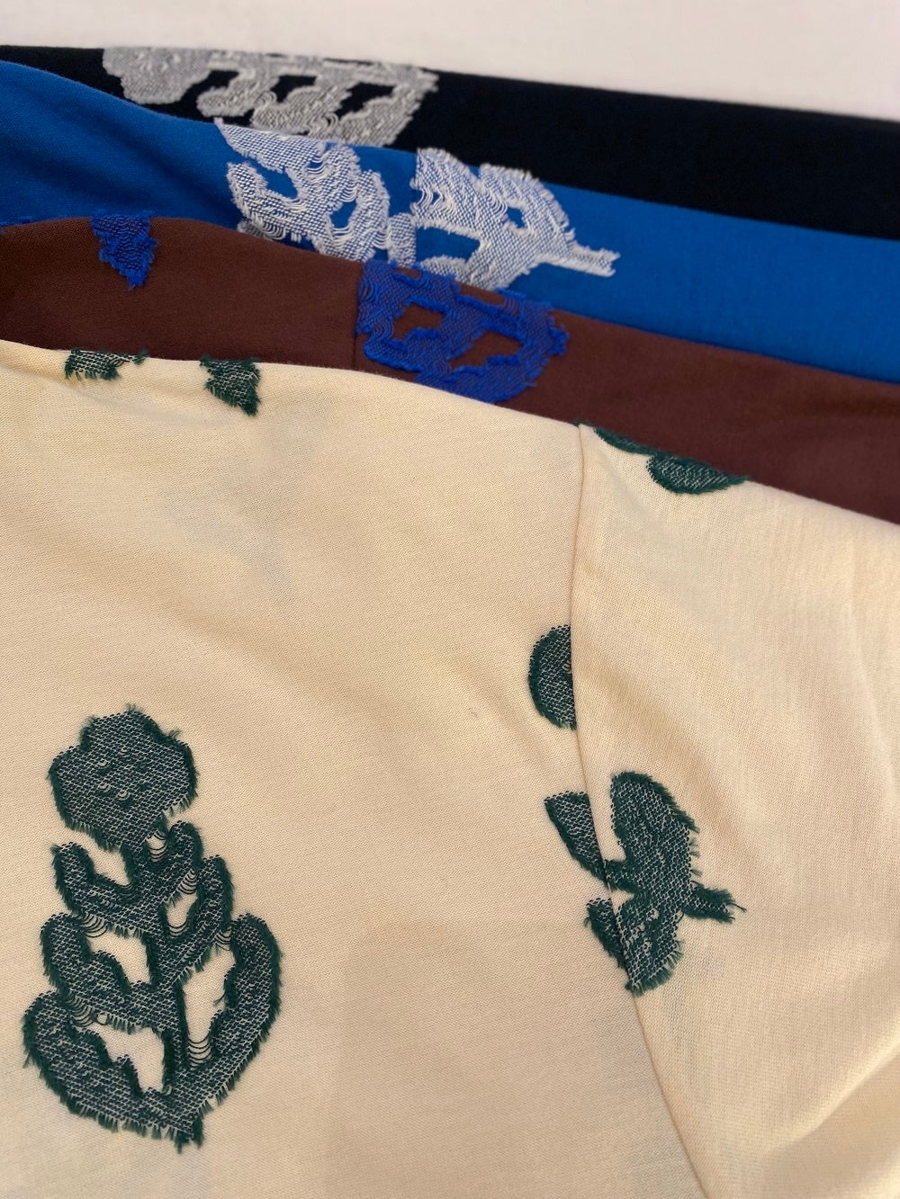 クッカはフィンランド語で「お花」を意味する言葉。野に咲く花をカットジャガードの手法で表現した、刺繍のような立体感のある風合いのテキスタイルです。このテキスタイルで作ったパフスリーブのスウェットプルオーバー、スナップボタンのカーディガン、柄・無地の切替がポイントのフレアワンピースの3種をご紹介します。