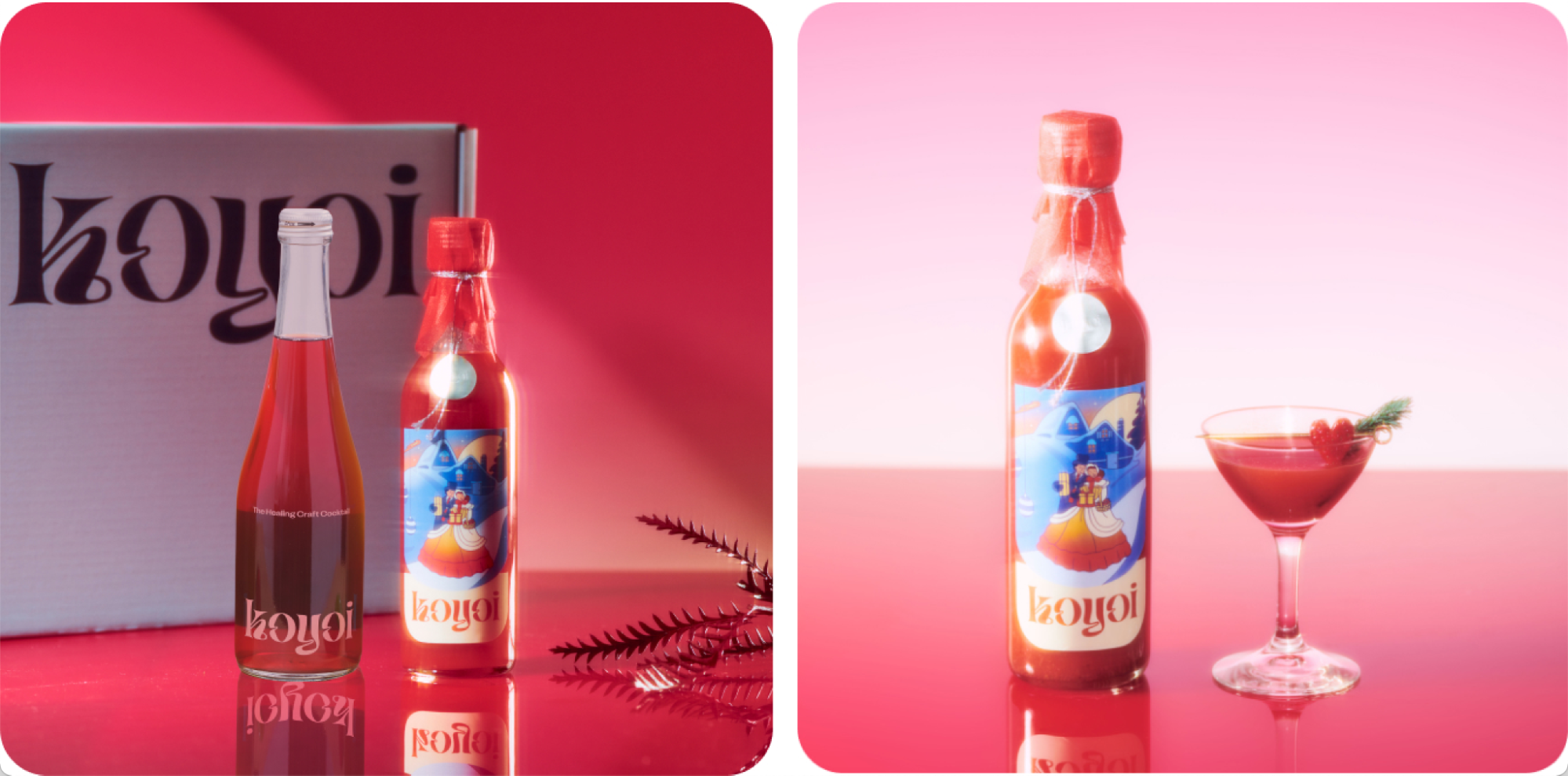 いちごのカクテルとパッションフルーツのカクテルの2本飲み比べセット。真っ赤で見た目が華やかなkoyoiとともに素敵な乾杯をご堪能ください。