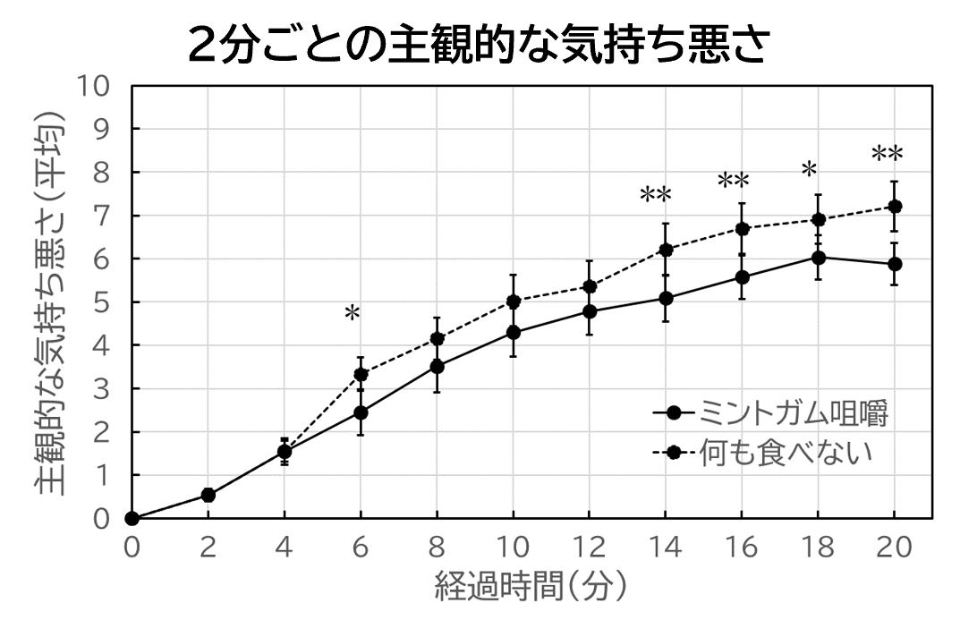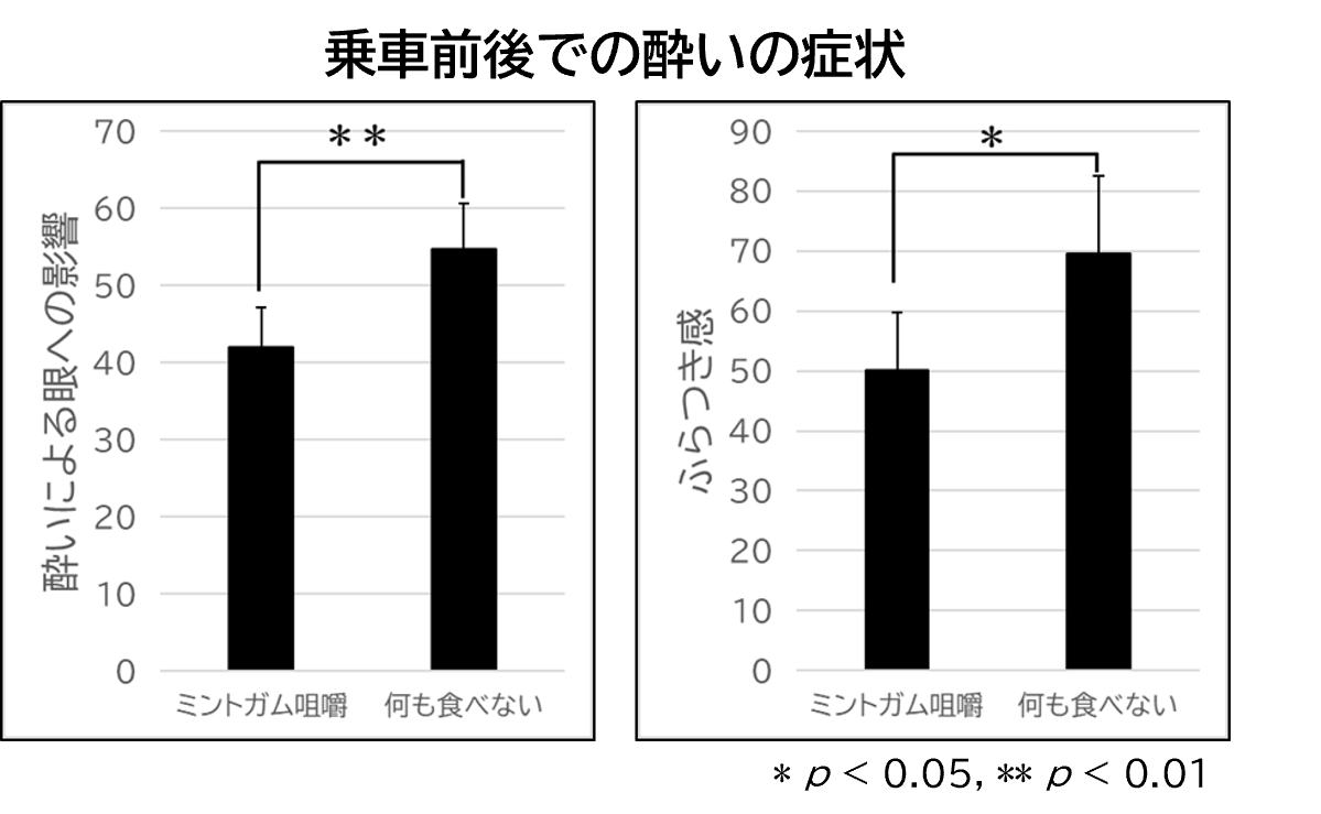 何も食べない条件に比べて、ミントガムを食べている条件のほうがが2分ごとの主観的な気持ち悪さが軽減することが確認されました。また、乗車前後での酔いの症状について、酔いによる目の疲れやふらつきという症状が軽減することが確認されました。