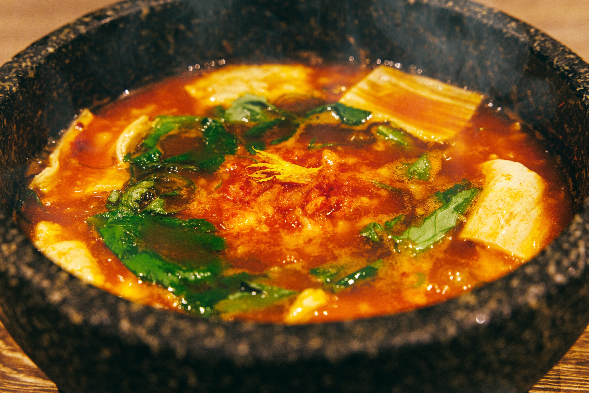 和牛テールと和出汁を合わせた特製スープに柔らかく炊いた旨みたっぷりの“シマチョウ”を添えて、熱々の石鍋で提供いたします。鬼おろしと九条ねぎの食感が心地よい石鍋です。