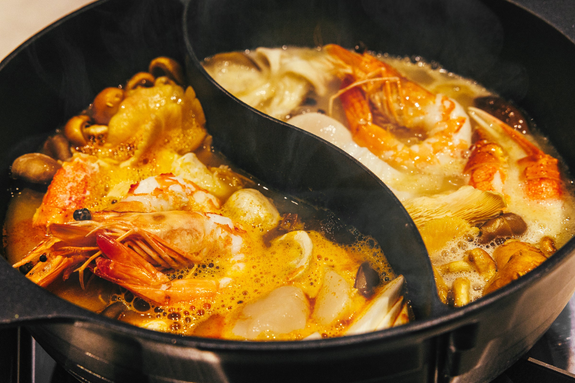 白湯(パイタン)・麻辣(マーラー)に加えて、今冬は新登場のトムヤムクンスープの3種類を用意いたしました。レモングラスの爽やかな酸みに唐辛子のあと引く辛みが癖になる大人気火鍋シリーズの最新作スープです。旬の海鮮とたっぷりのキノコをお好みで選ぶ2種類の薬膳スープでお召し上がりください。