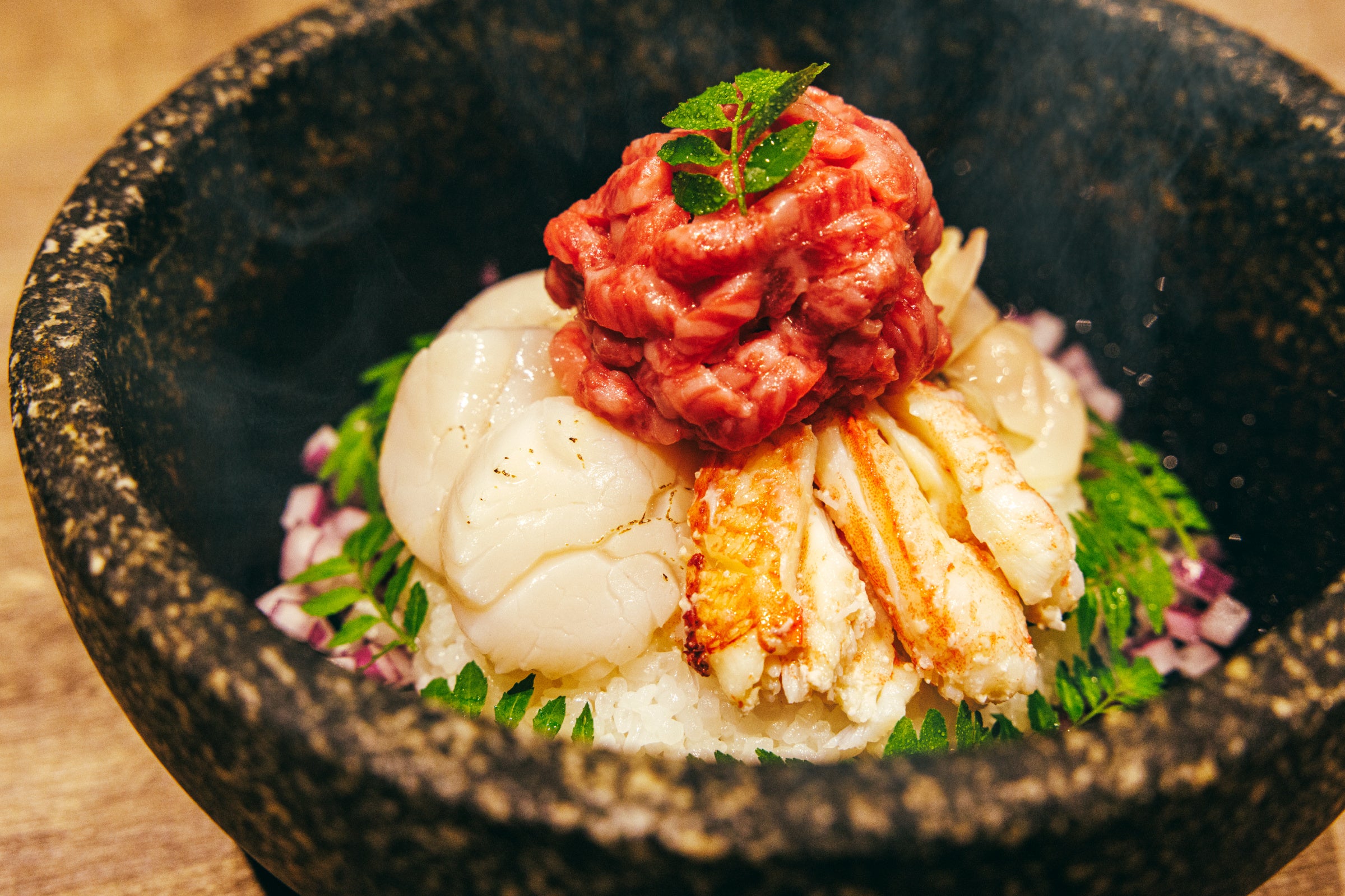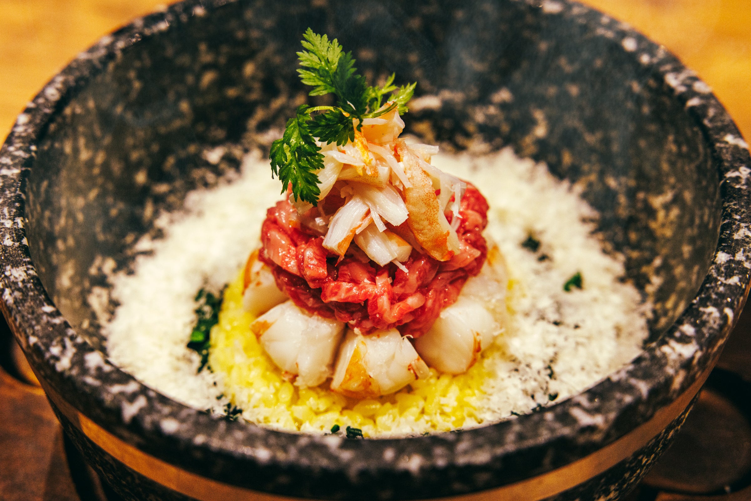 鮮度抜群の和牛ユッケに“ズワイ蟹”と“海老”を添えて、たっぷりのチーズと特製のチーズソースを豪快に注ぎ入れて仕上げます。たち昇る香ばしい香りが食欲をそそる新作の石焼リゾットです。