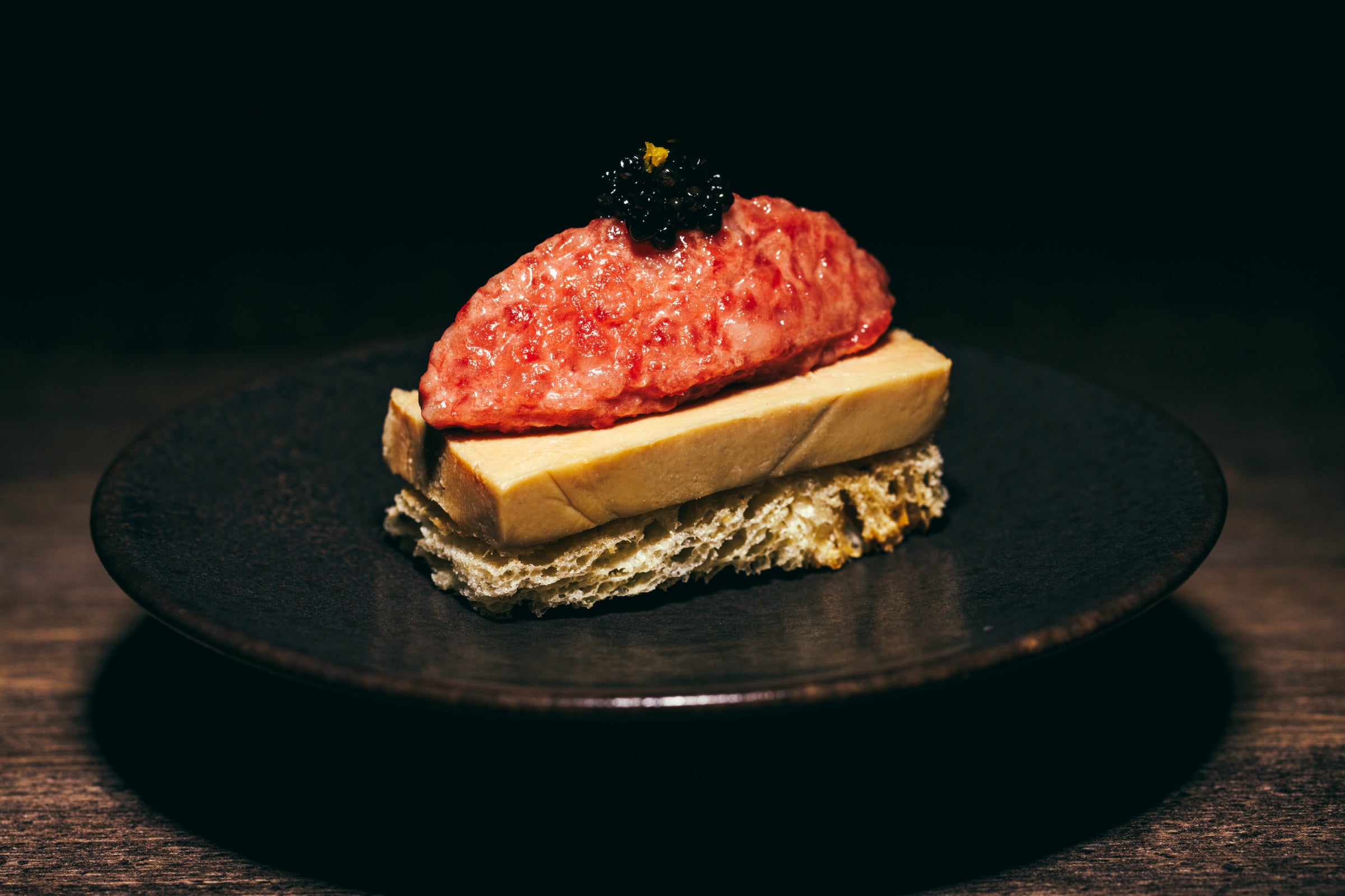 口どけの良いフォアグラテリーヌと厳選した赤身肉にキャビアを添えて、サクサクのデニッシュとお召し上がりください。テリーヌのコクとキャビアの塩みが、和牛の凝縮した旨みを更に引き立てます。