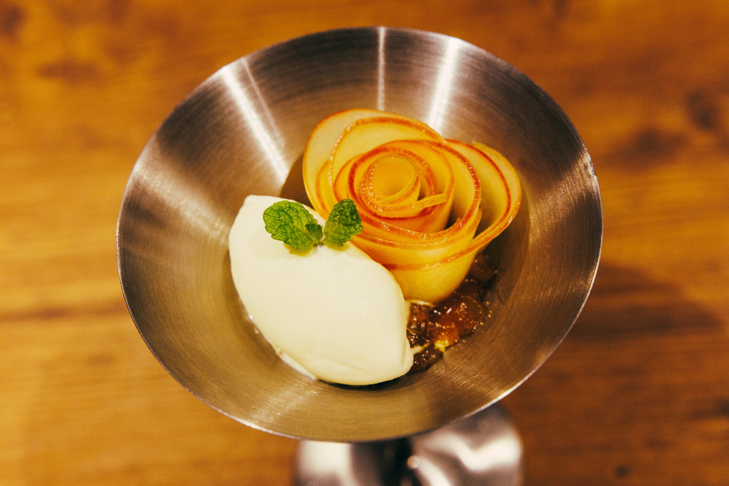 フランスの伝統菓子“タルトタタン”をバンビーナ風にアレンジし、ほろ苦く香ばしい柔らかなりんごキャラメリゼにバニラアイスを合わせました。りんごを薔薇に見立てた、可愛らしいスイーツです。