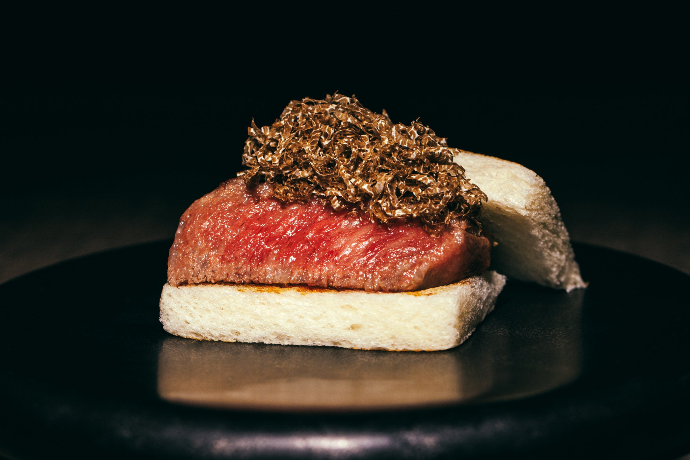 “特選サーロイン”を重ね合わせて、中心はシルキーに表面をカリっと焼き上げました。仕上げに芳醇な黒トリュフをたっぷりと削り、やわらかなパンでサンドした至極の逸品です。