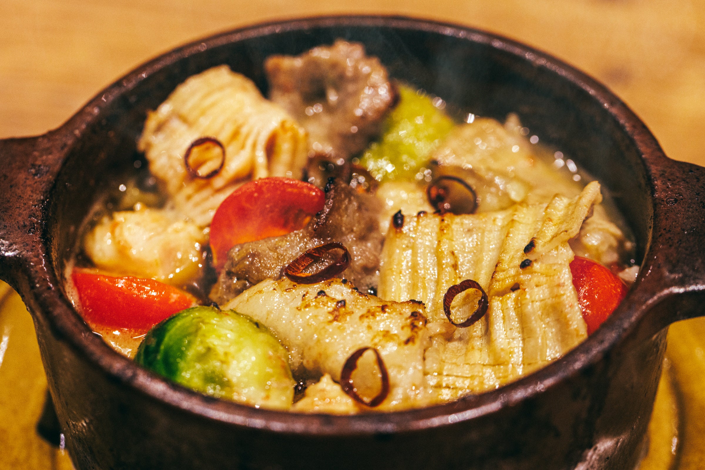 上ミノ・ツラミ・シマチョウと旬野菜を自慢のオリジナルブレンド“ガーリックオイル”で煮込みました。オイルに溶け出した素材の旨みと小気味よい食感をご堪能いただける新作タパスです。