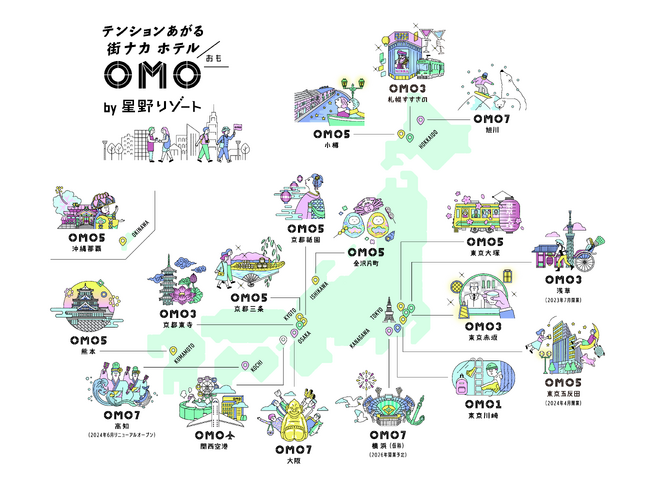 「OMO」は星野リゾートが全国に展開する「テンションあがる『街ナカ』ホテル」。街をこよなく愛するスタッフが地域の方々と仕掛ける、新感覚のホテル。思いもよらない魅力に出会い、知らず知らずのうちにその街までお気に入りに。現在15施設を展開し、2023年7月には「OMO3浅草」が誕生。2024年には、OMO5東京五反田の開業、OMO7高知のリニューアルオープンを予定しています。